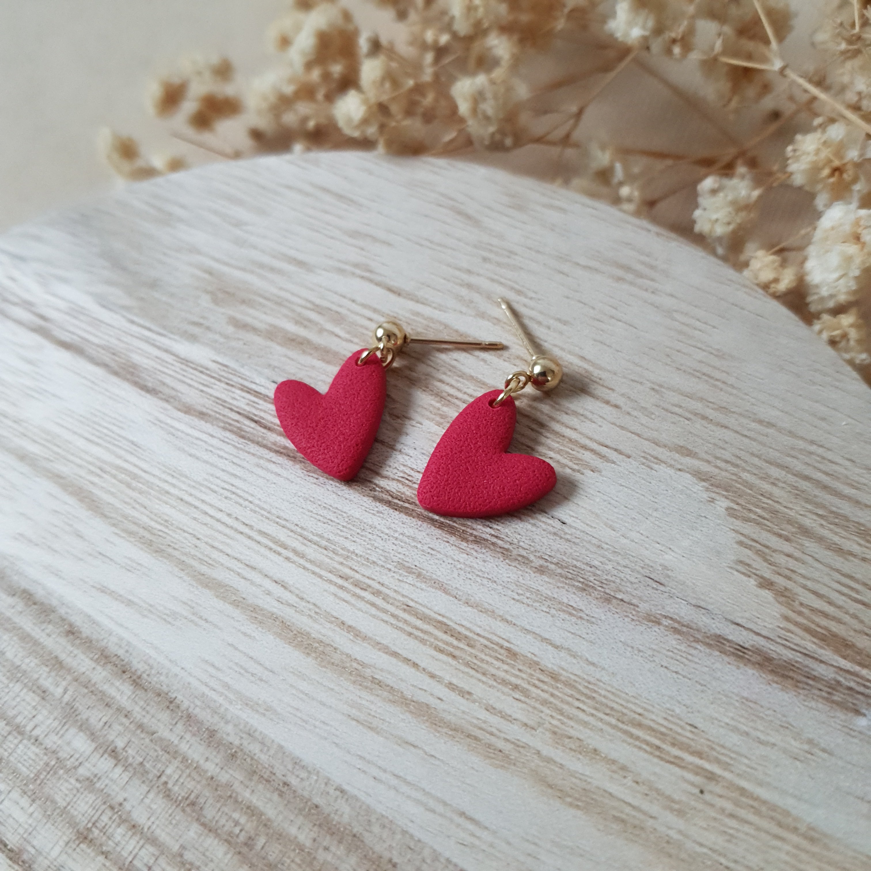 Handmade heart dangle earrings. Size – total length: 2.2 cm or 0.86 inch. Surface-texture: matte, glossy. Jewelry material: polymer clay, resin, gold plated stainless steel.