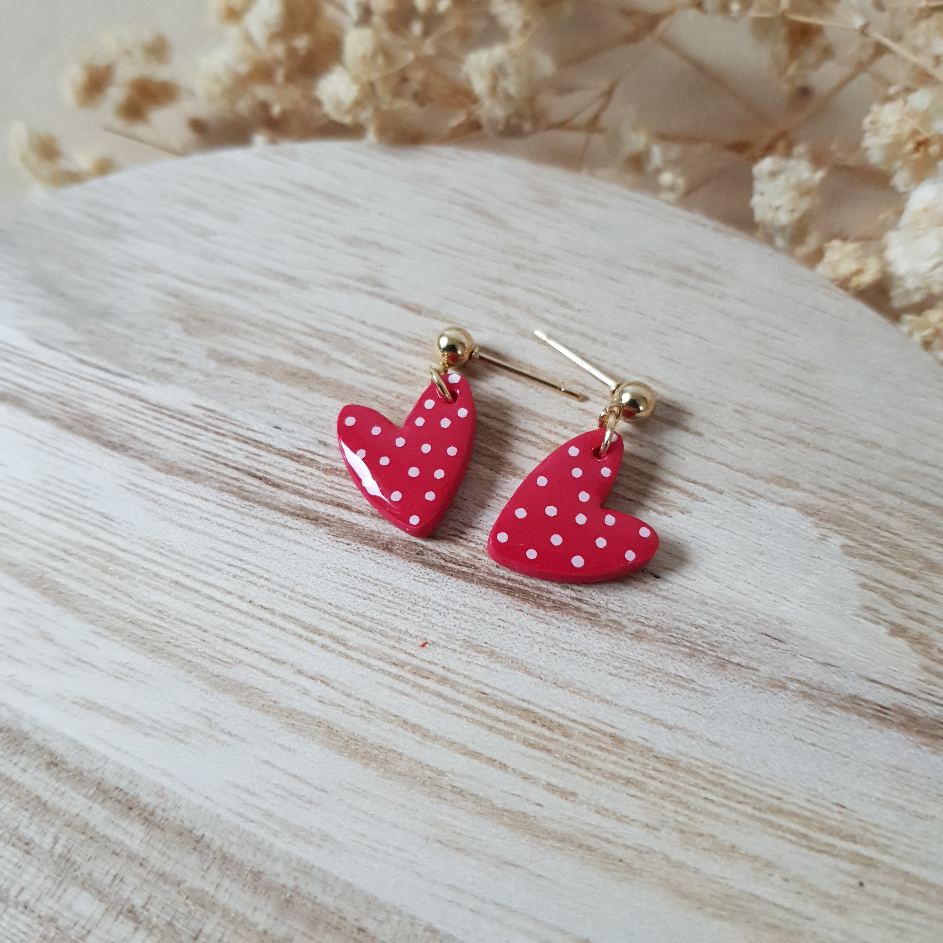 Handmade heart dangle earrings. Size – total length: 2.2 cm or 0.86 inch. Surface-texture: glossy. Jewelry material: polymer clay, resin, gold plated stainless steel.