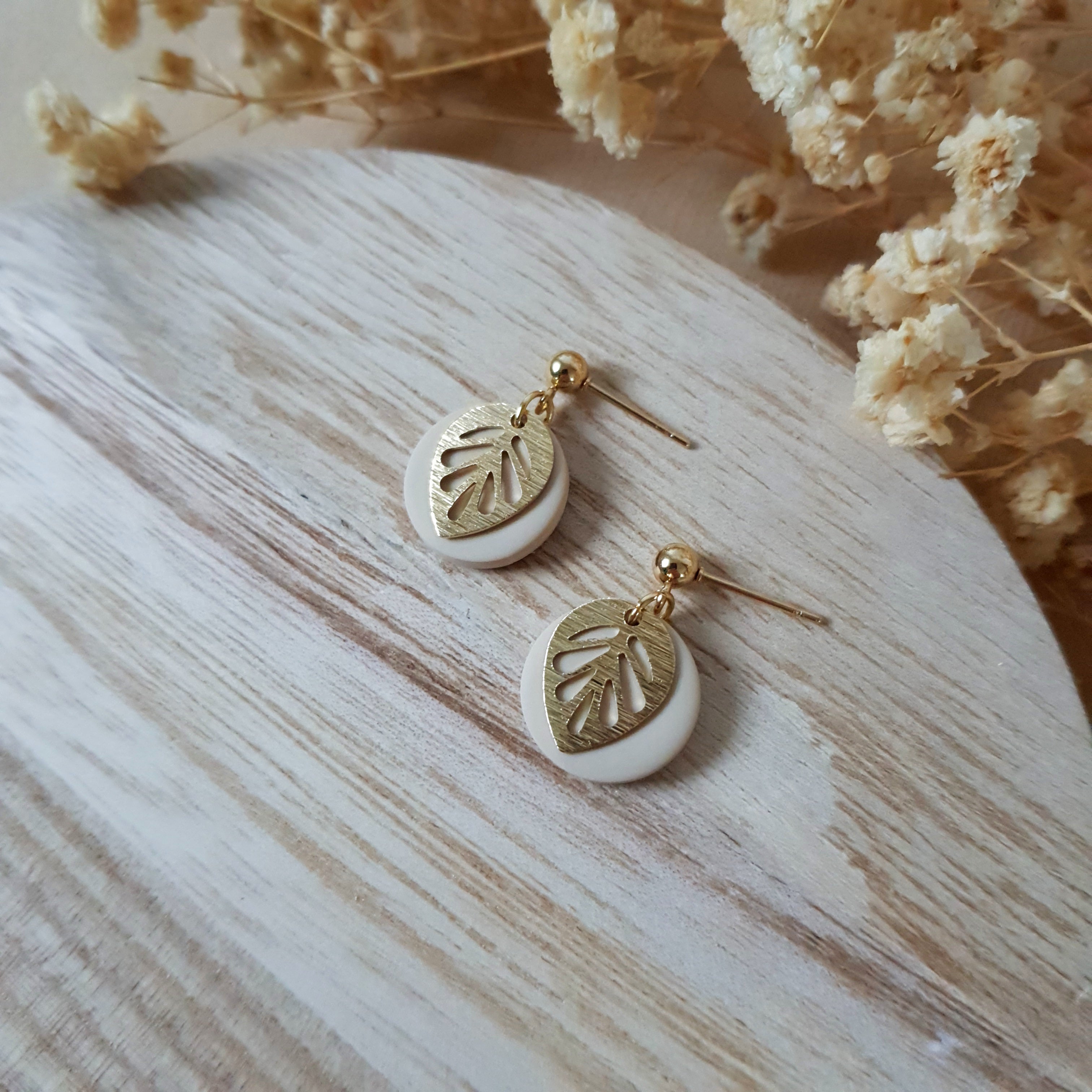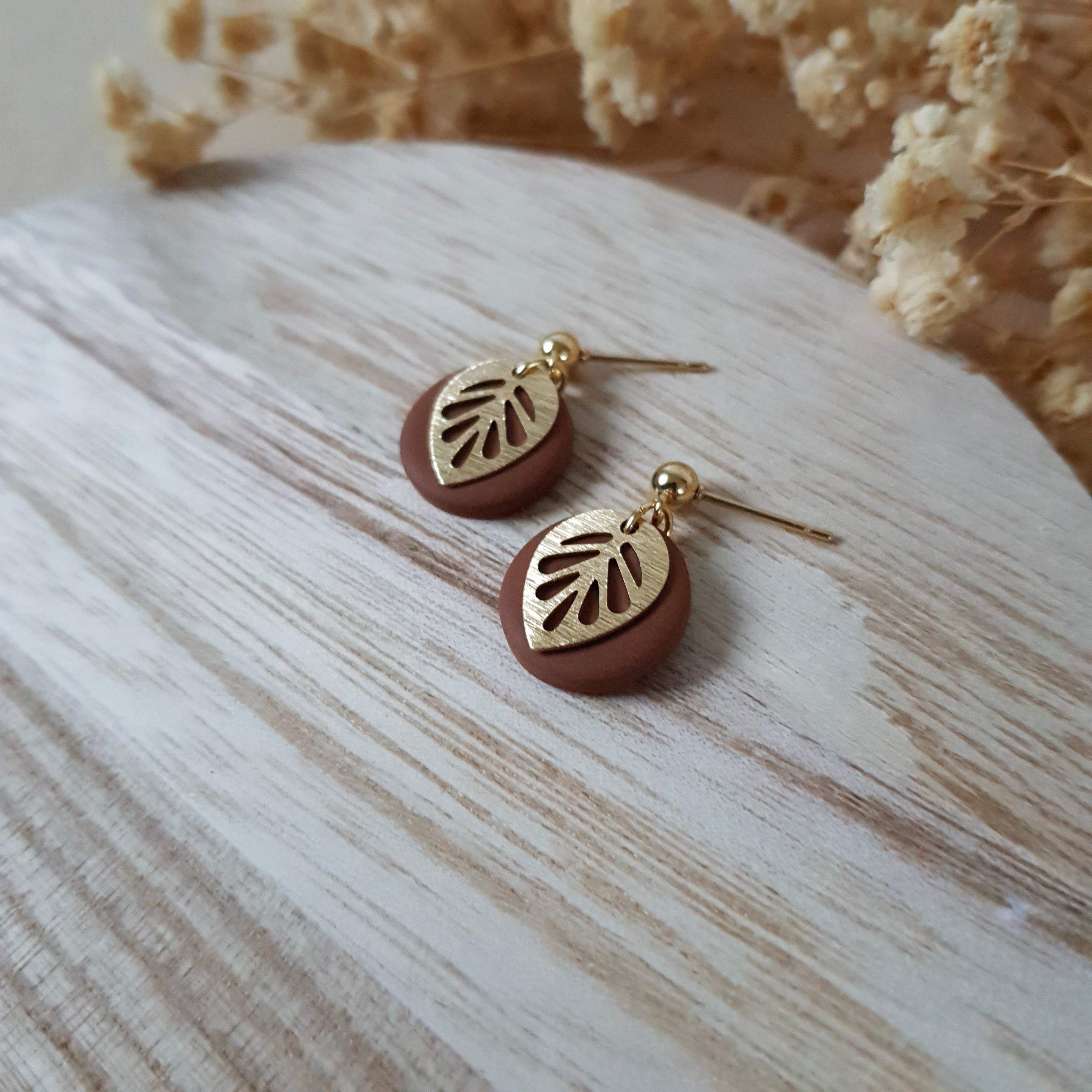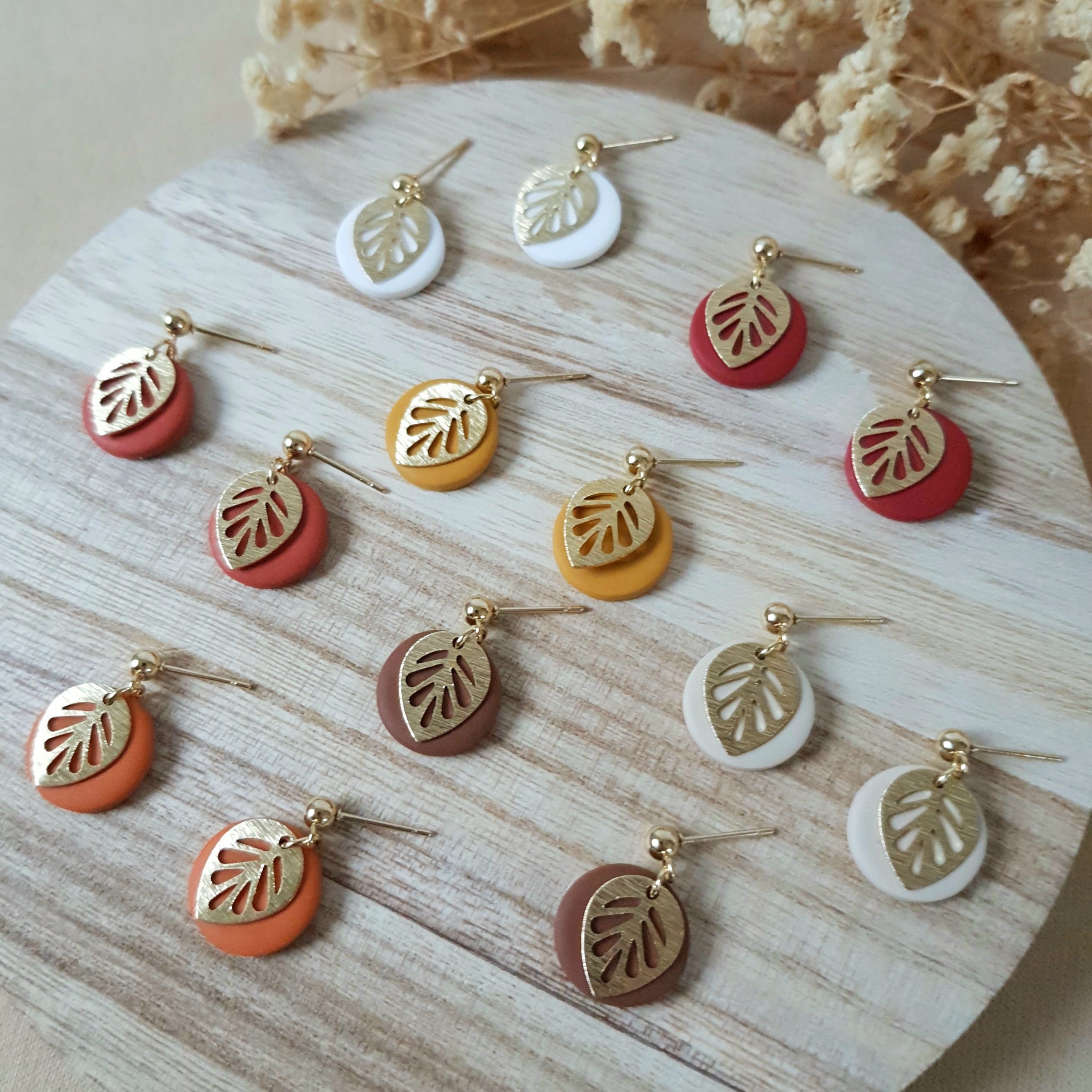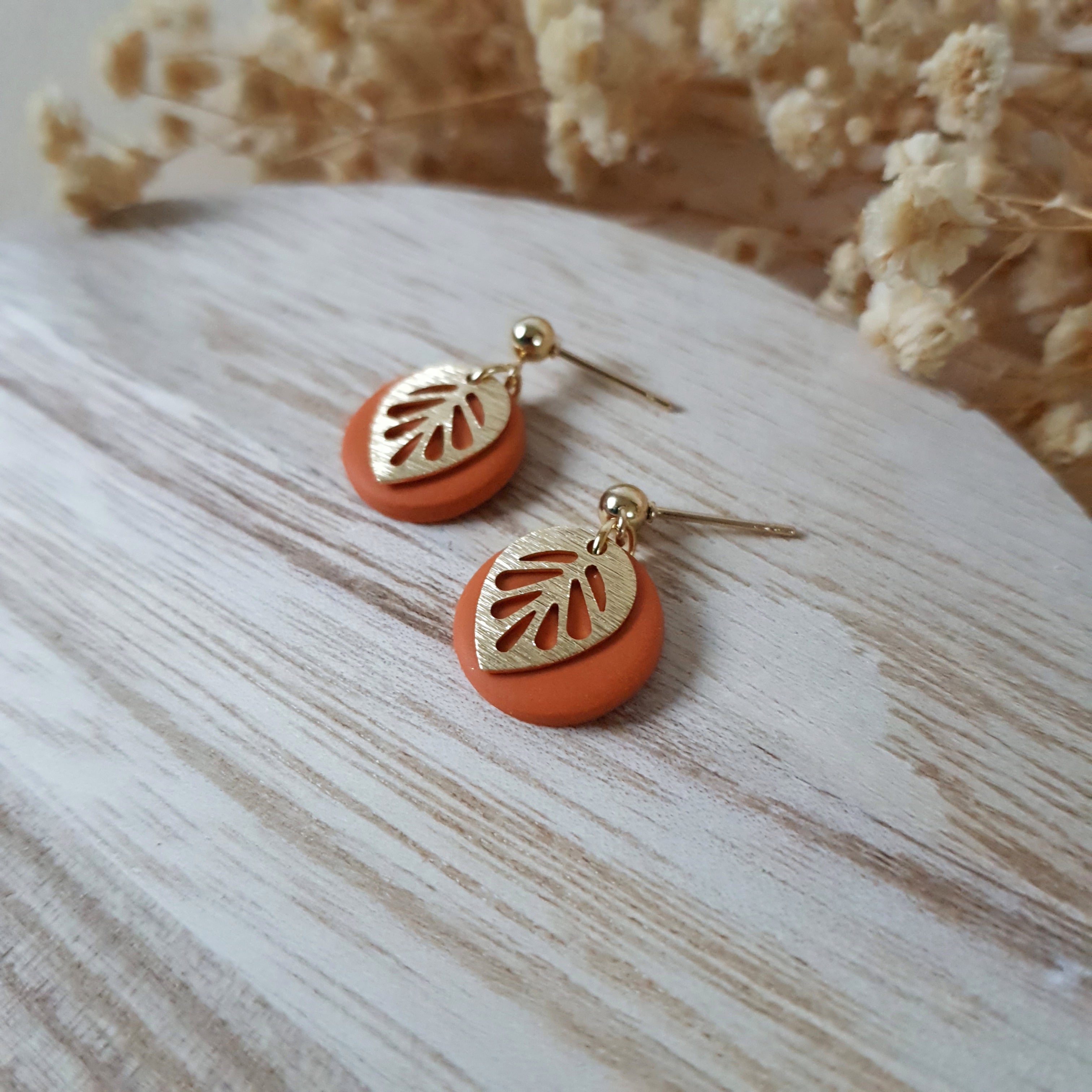 Handmade autumn leaf earrings. Size – total length: 2.4 cm or 0.94 inch. Surface-texture: matte, glossy (backside). Jewelry material: polymer clay, resin, stainless steel.
