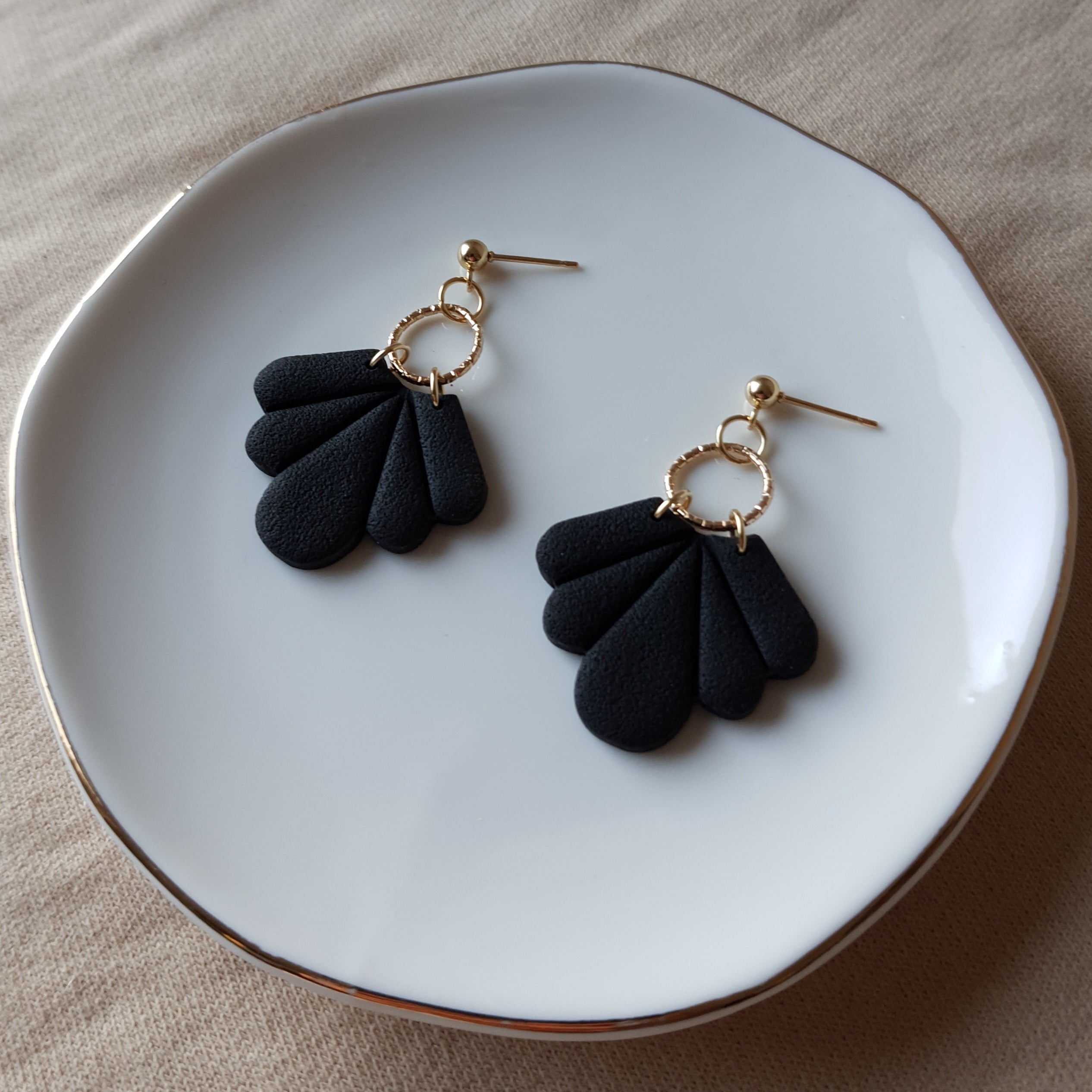Handmade black fan dangle earrings. Size – total length: 4.7 cm or 1.85 inch Surface-texture: matte, glossy (backside). Jewelry material: polymer clay, resin, stainless steel.