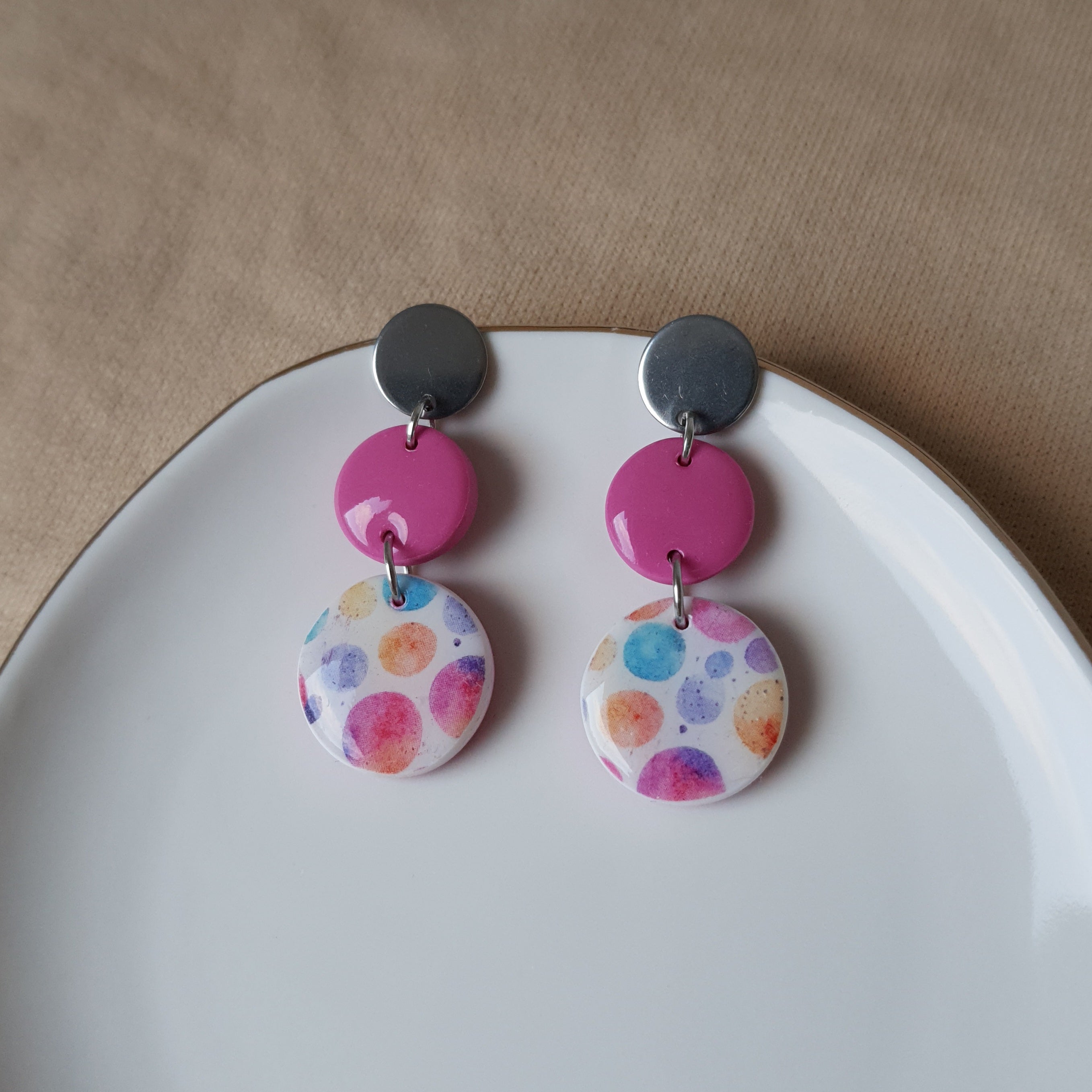 Handmade bubbly dangle earrings Size – total length: 4.8 cm or 1.89 inch. Surface-texture: glossy. Jewelry material: polymer clay, resin, stainless steel.