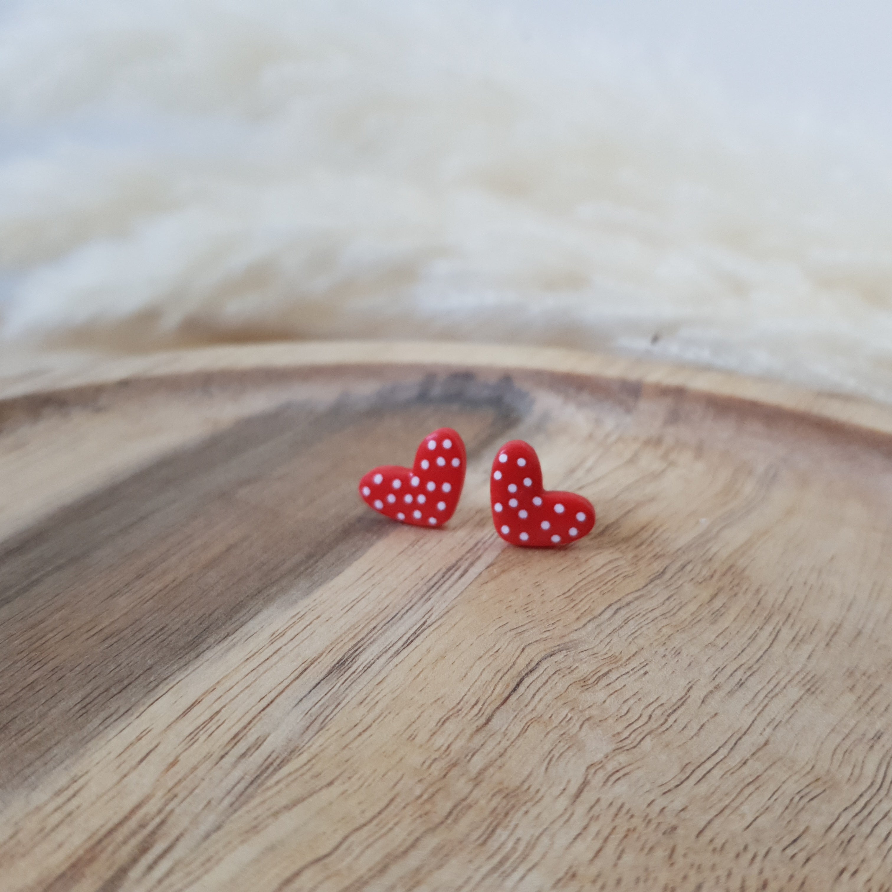 Handmade spotted heart stud earrings. Size – total length: 1 cm or 0.39 inch. Surface-texture: semi-glossy. Jewelry material: polymer clay, resin, stainless steel.