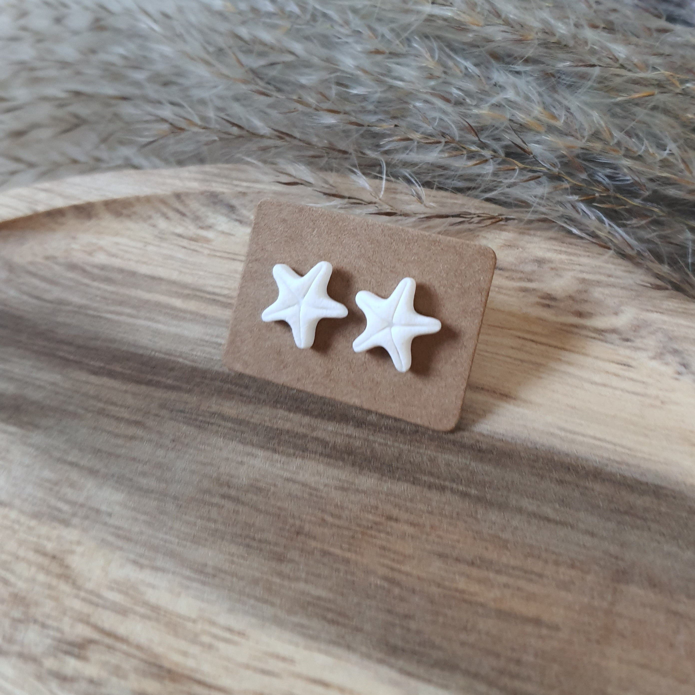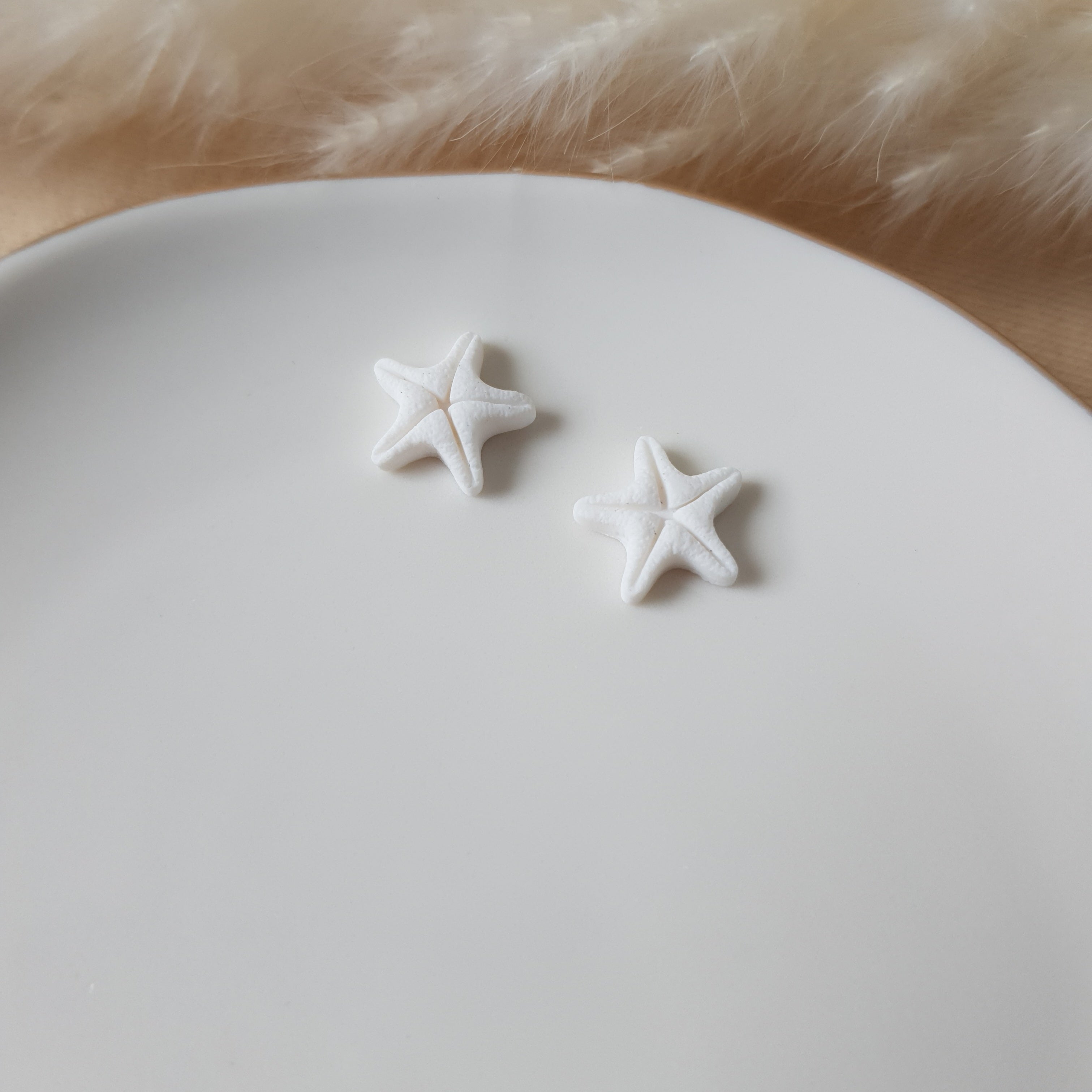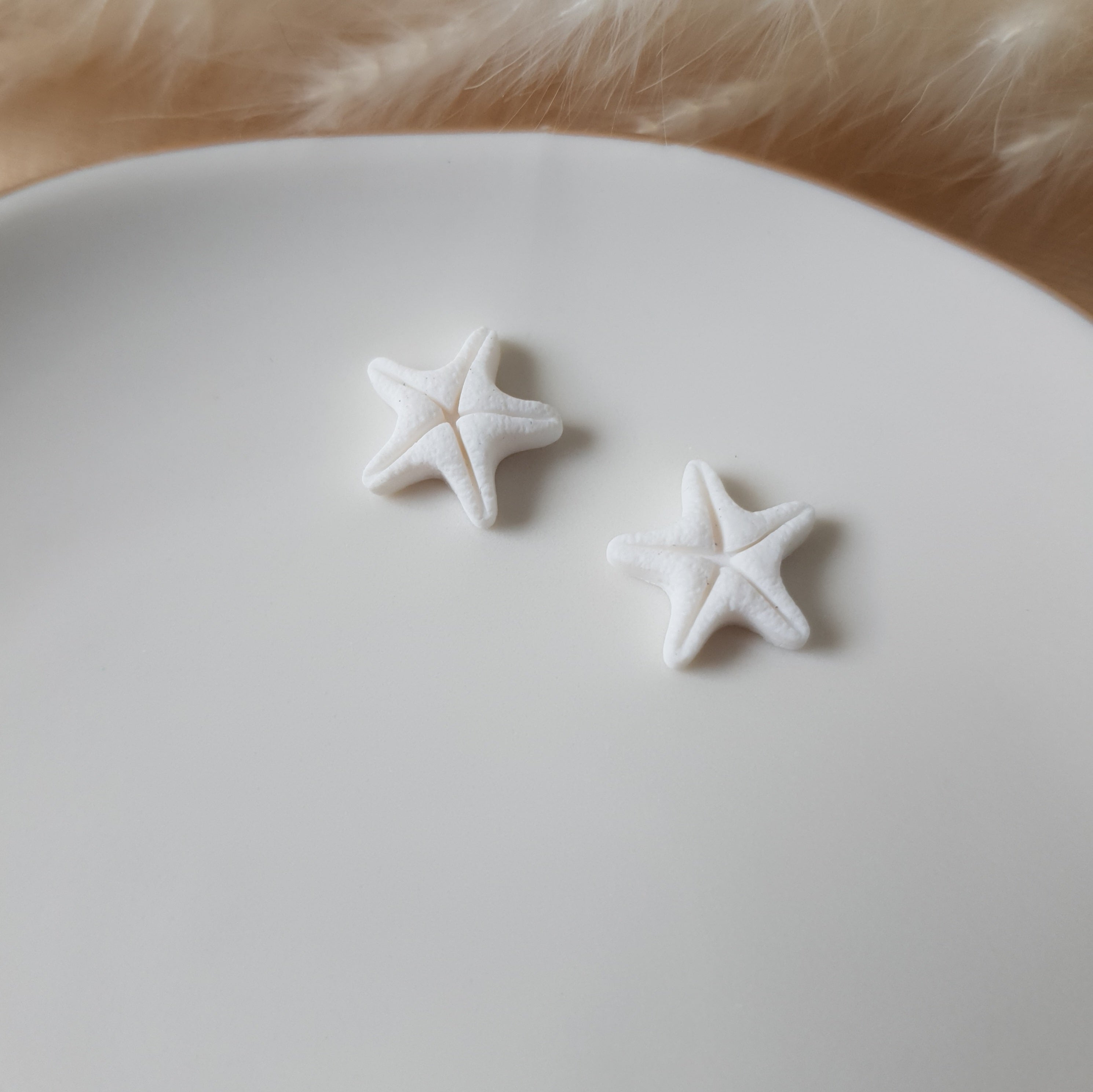 Handmade sea star earrings. Size – total length: 1.2 cm or 0.47 inch. Surface-texture: matte. Jewelry material: polymer clay, resin, stainless steel.