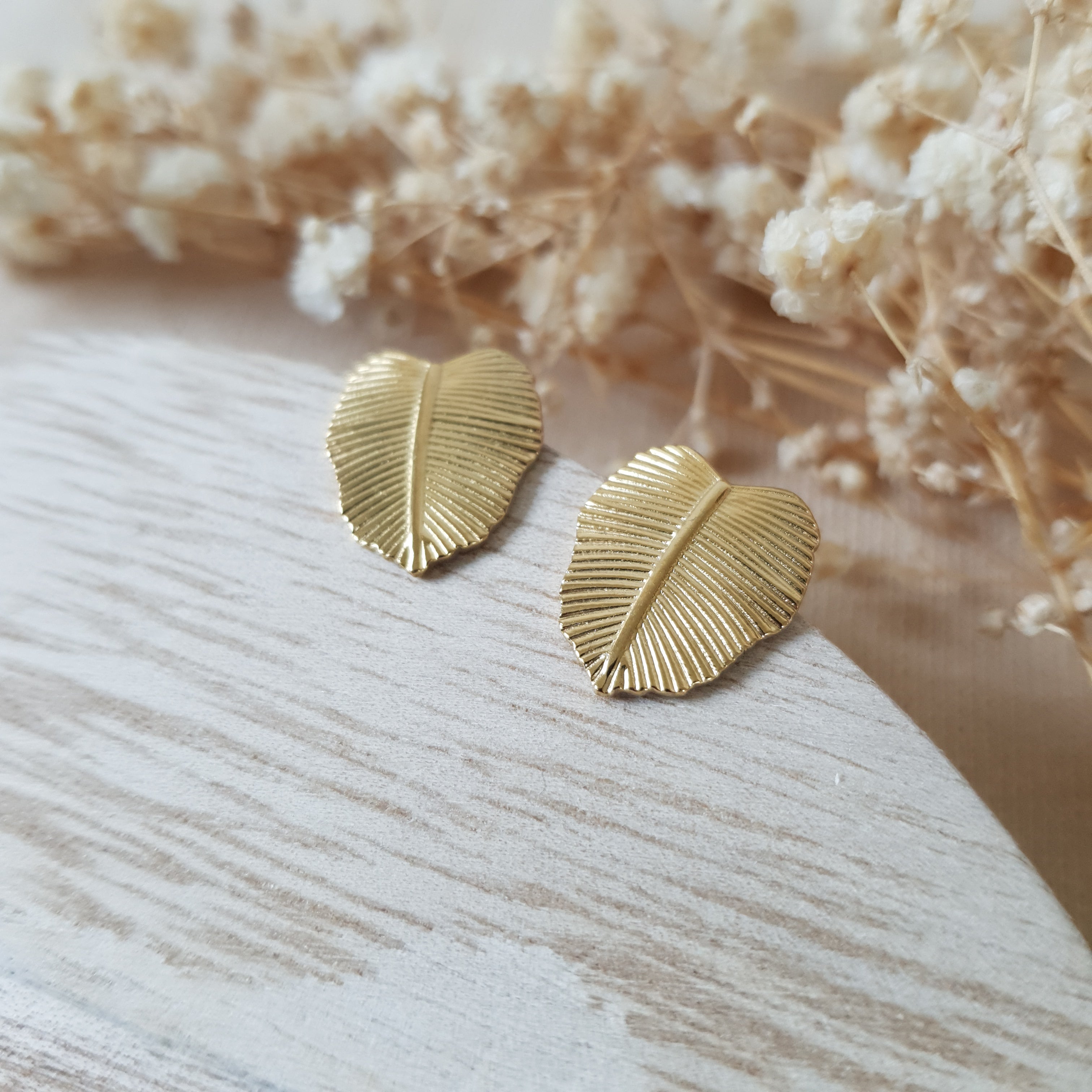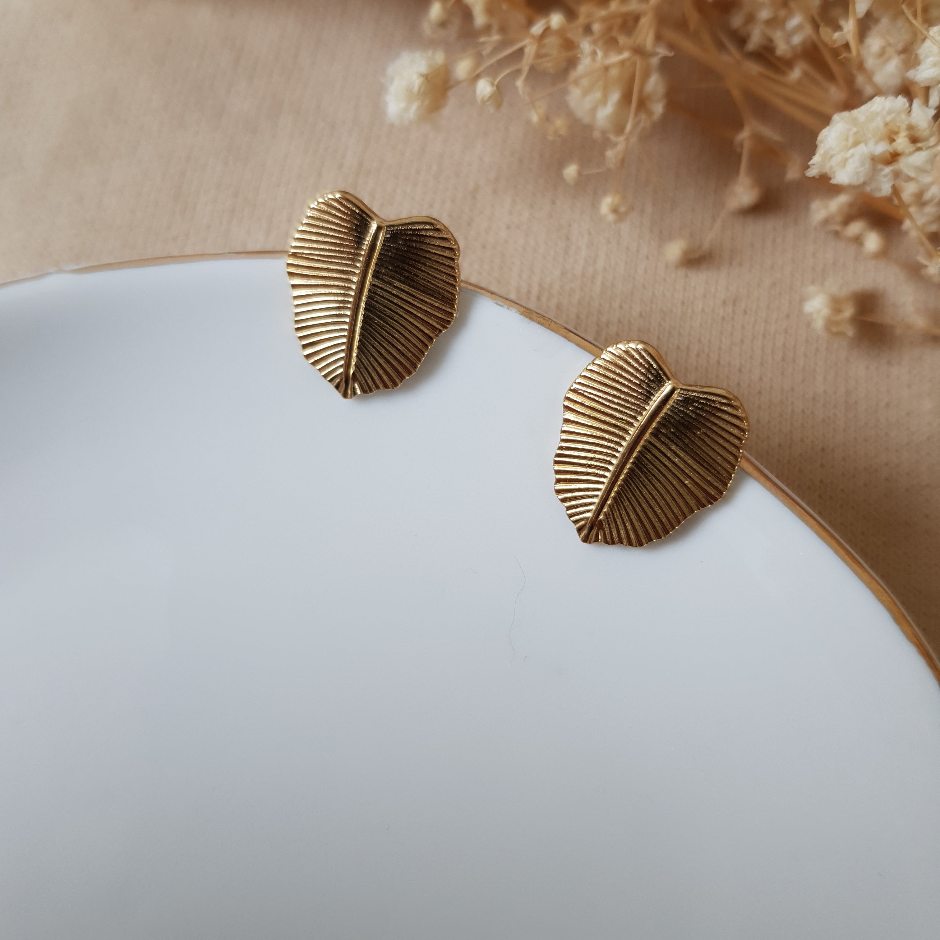 Gold monstera stud earrings. Size – total length: 1.6 cm or 0.62 inch. Jewelry material: stainless steel, 18k gold plated.