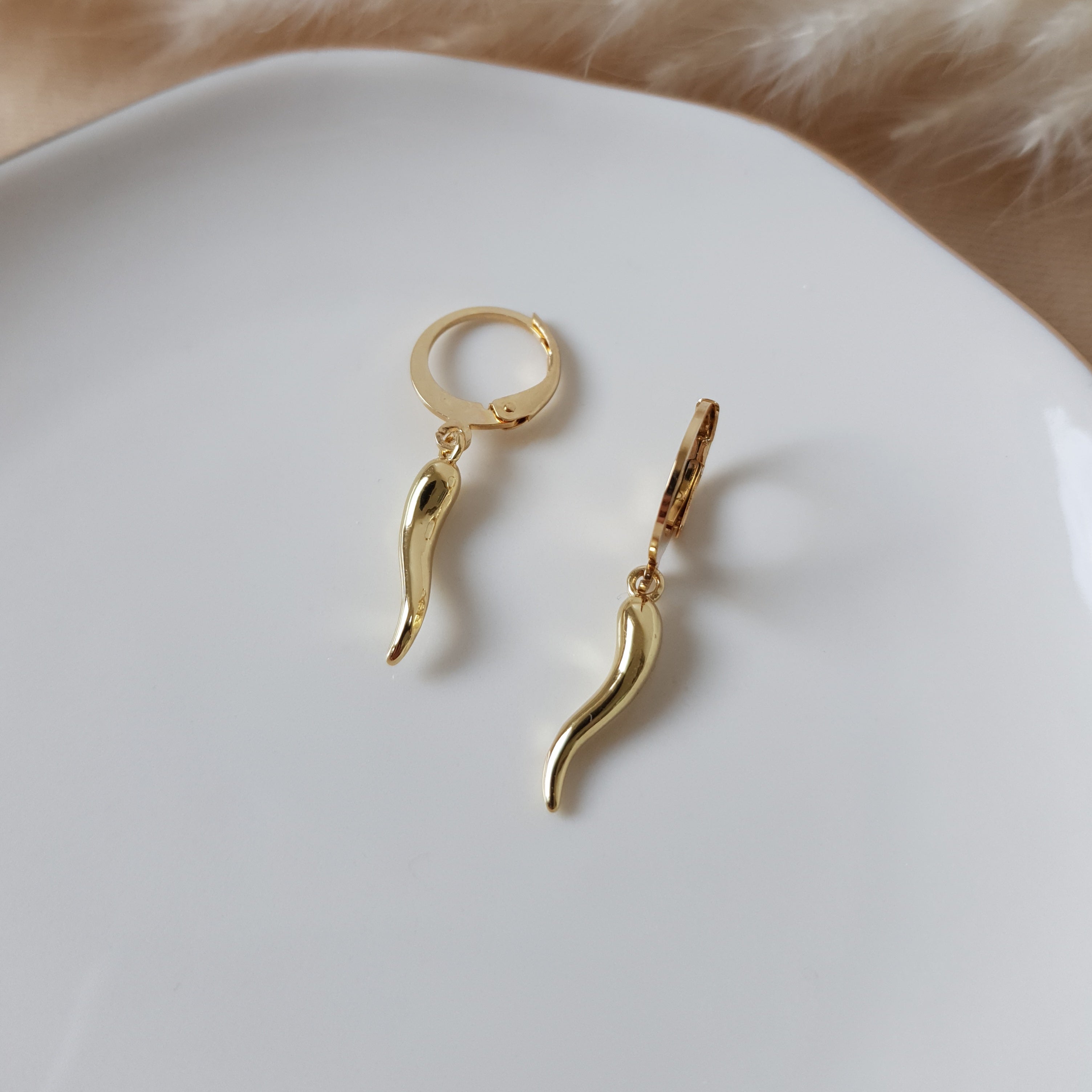 Golden chilli earrings. Size – total length: 3.1 cm or 1.22 inch. Surface-texture: 18k gold plated. Jewelry material: stainless steel, brass pendant.