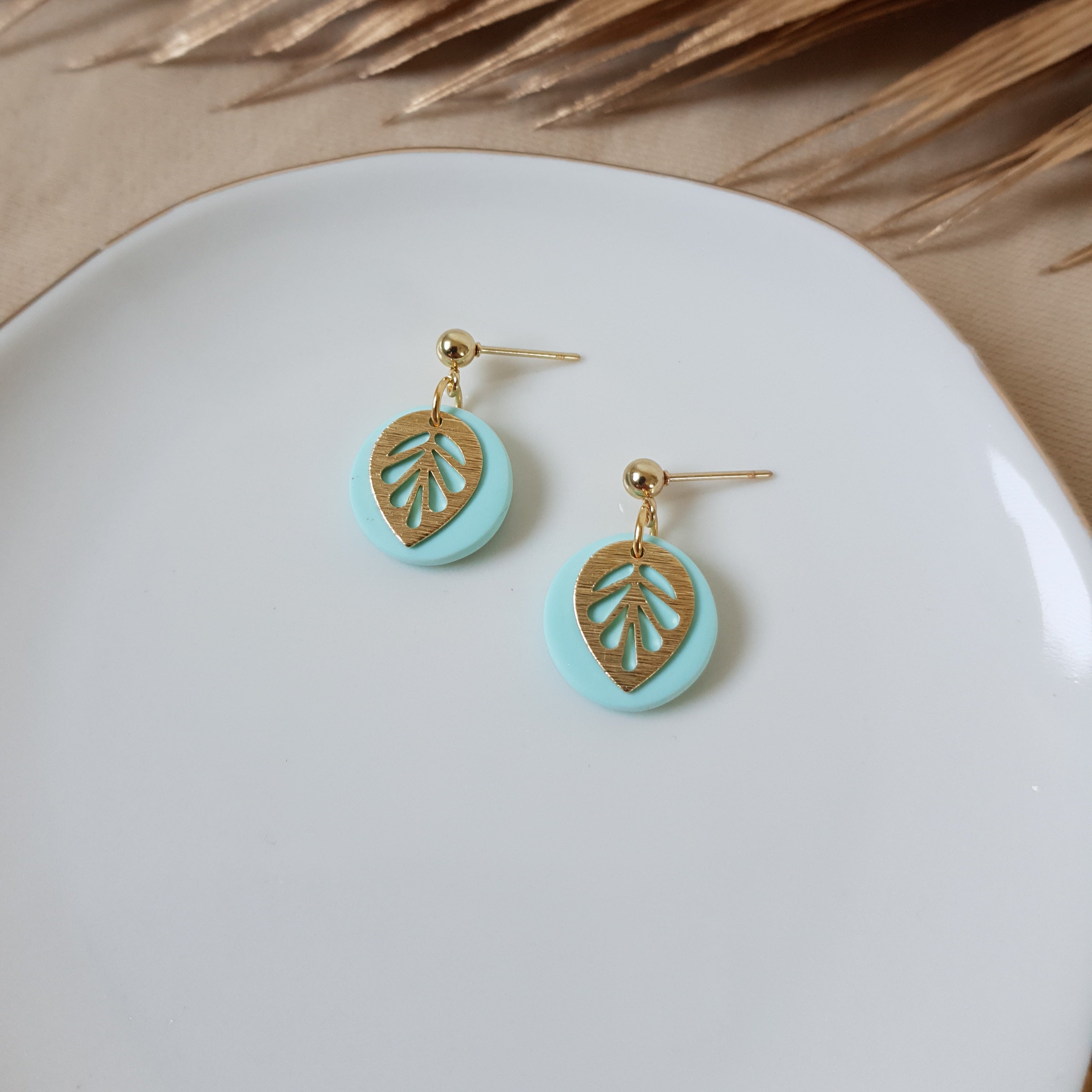 Handmade gold leaf earrings. Size – total length: 2.4 cm or 0.94 inch. Surface-texture: matte, glossy (backside). Jewelry material: polymer clay, resin, stainless steel.