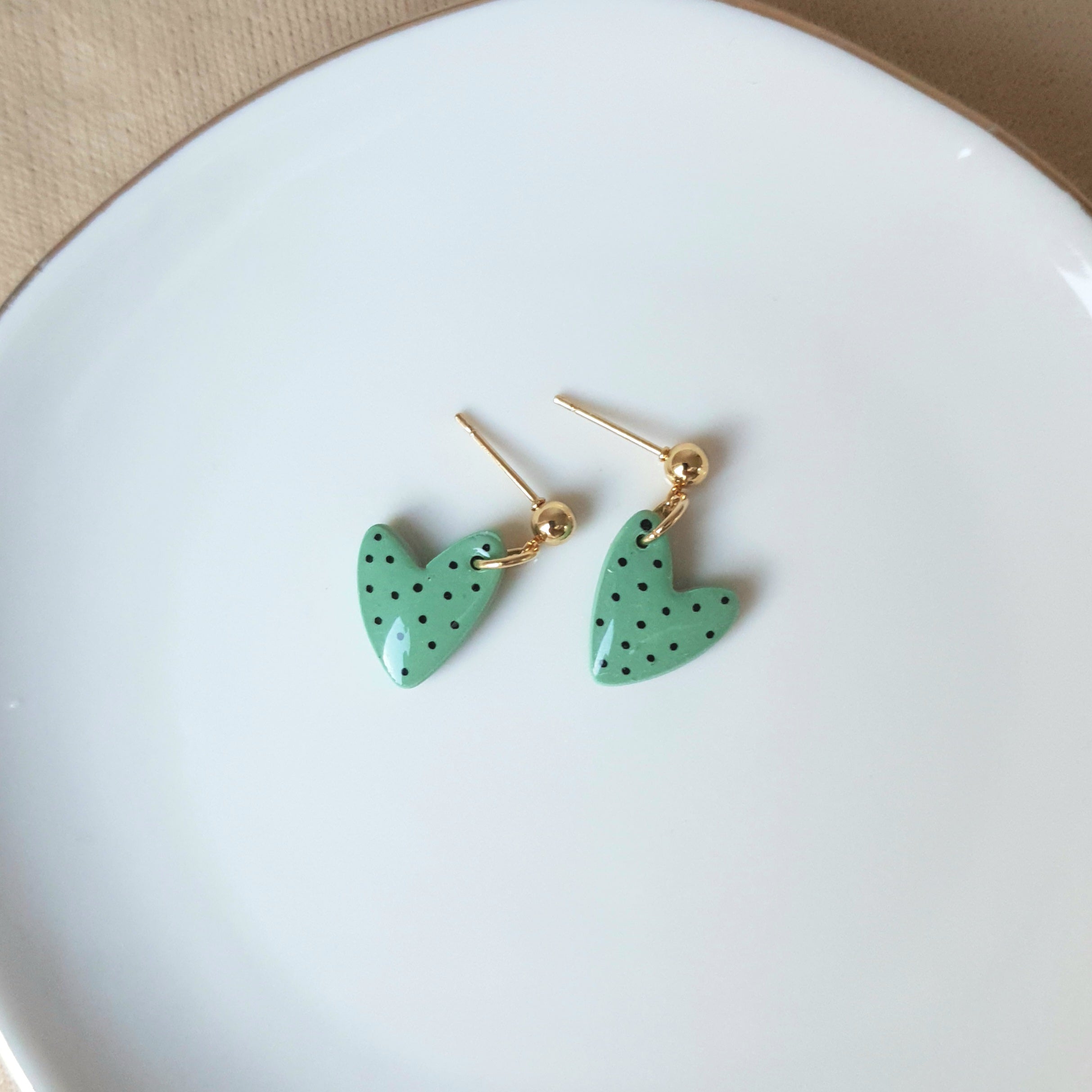 Handmade spotted dangly heart earrings. Size – total length: 2.2 cm or 0.86 inch. Surface-texture: glossy. Jewelry material: polymer clay, resin, stainless steel.