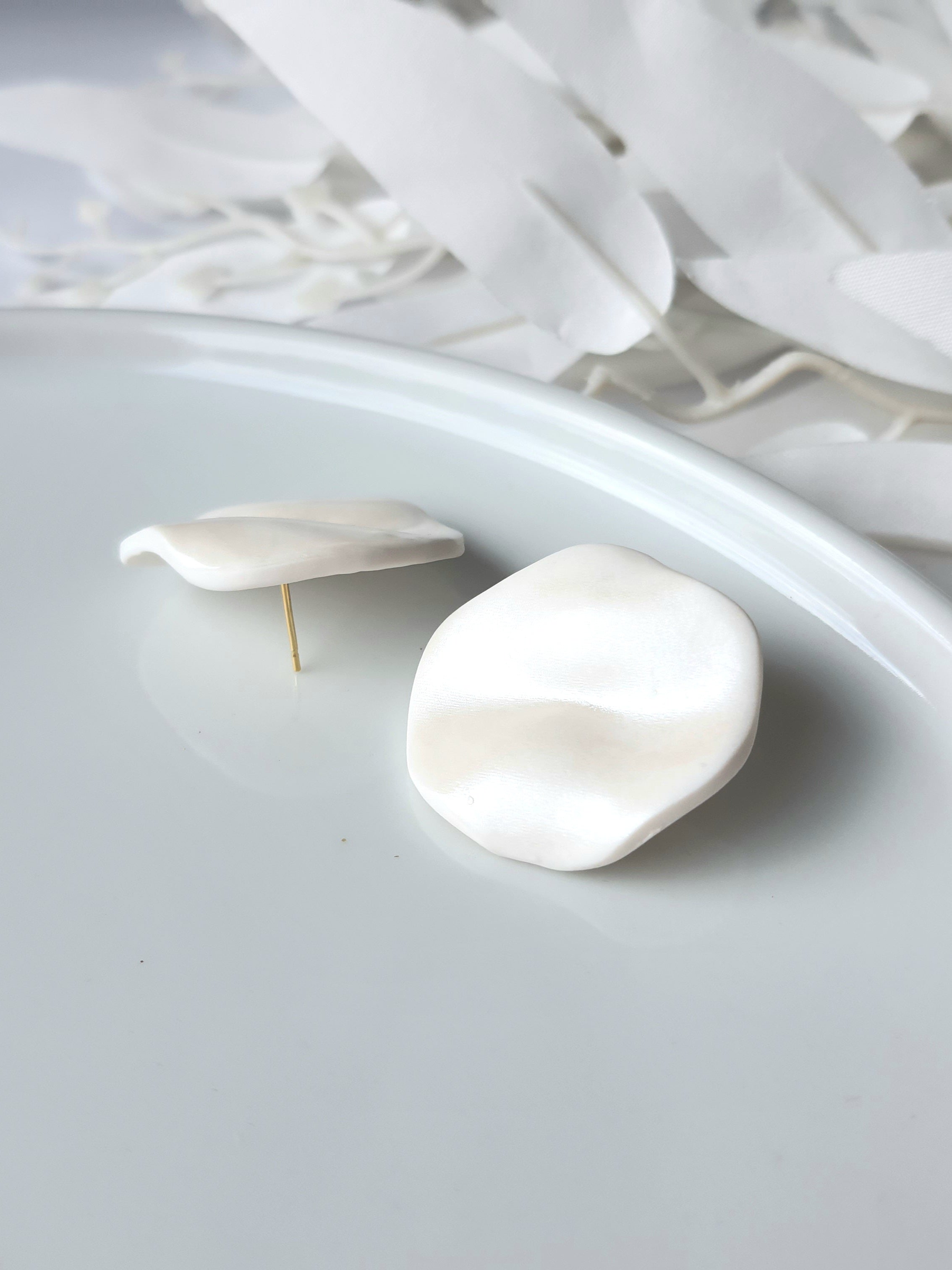 Handmade stud earrings. Size: -length: 2.7 cm or 1.06 inch -width: 3.2 cm or 1.30 inch Surface-texture: pearly semi-glossy. Jewelry material: polymer clay, resin, stainless steel.