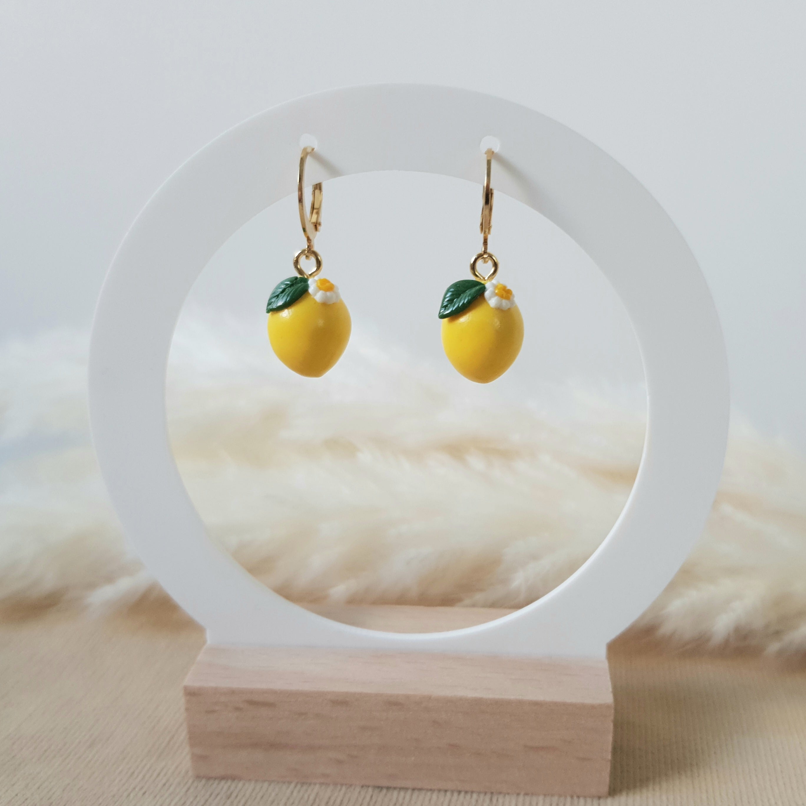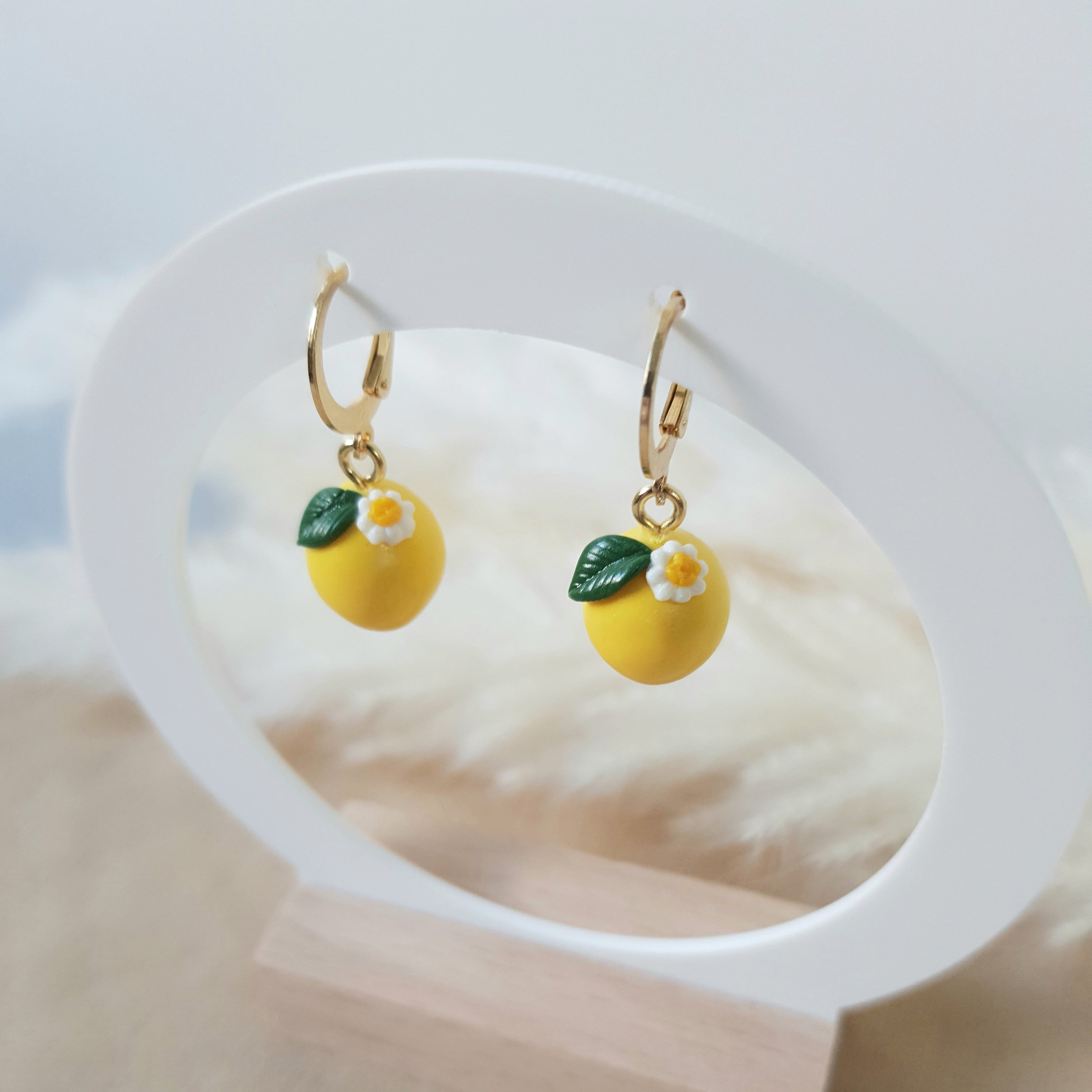 Handmade lemon earrings. Size – total length: 2.8 cm or 1.10 inch. Surface-texture: semi-glossy. Jewelry material: polymer clay, gold plated stainless steel.