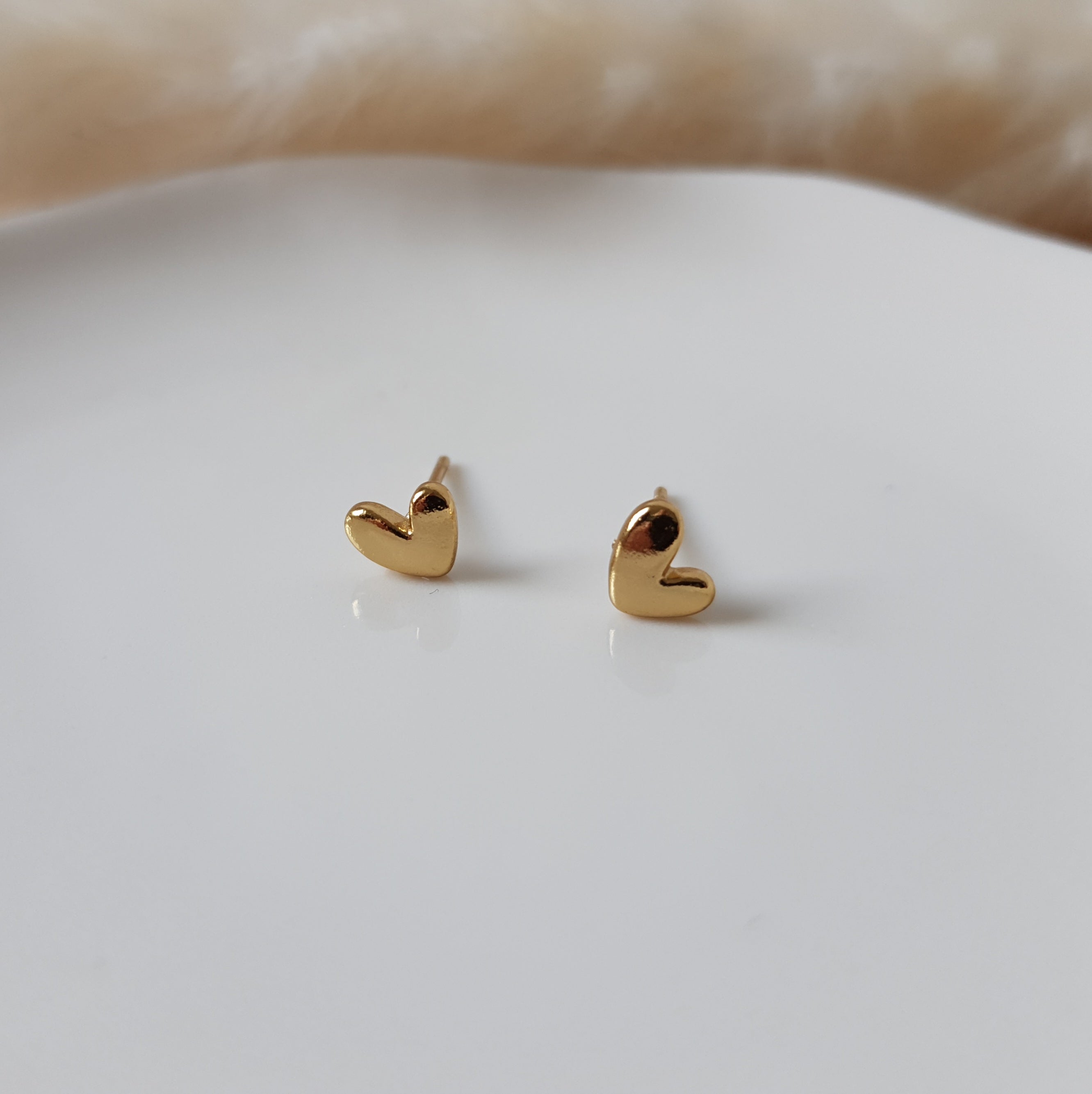 Mini gold heart earrings. Size – total length: 0.6 cm or 0.23 inch. Surface-texture: 18k gold plated. Jewelry material: stainless steel.
