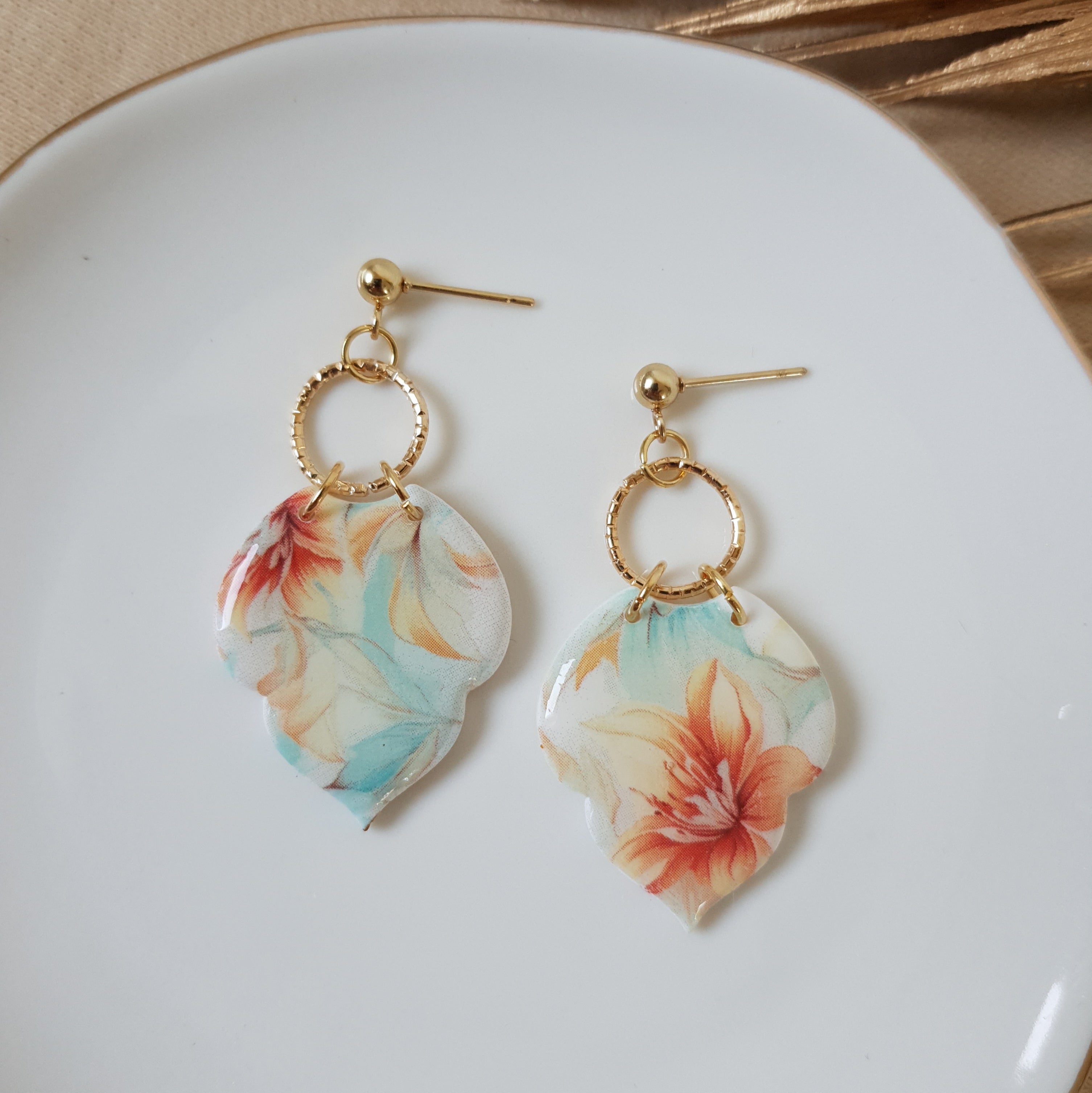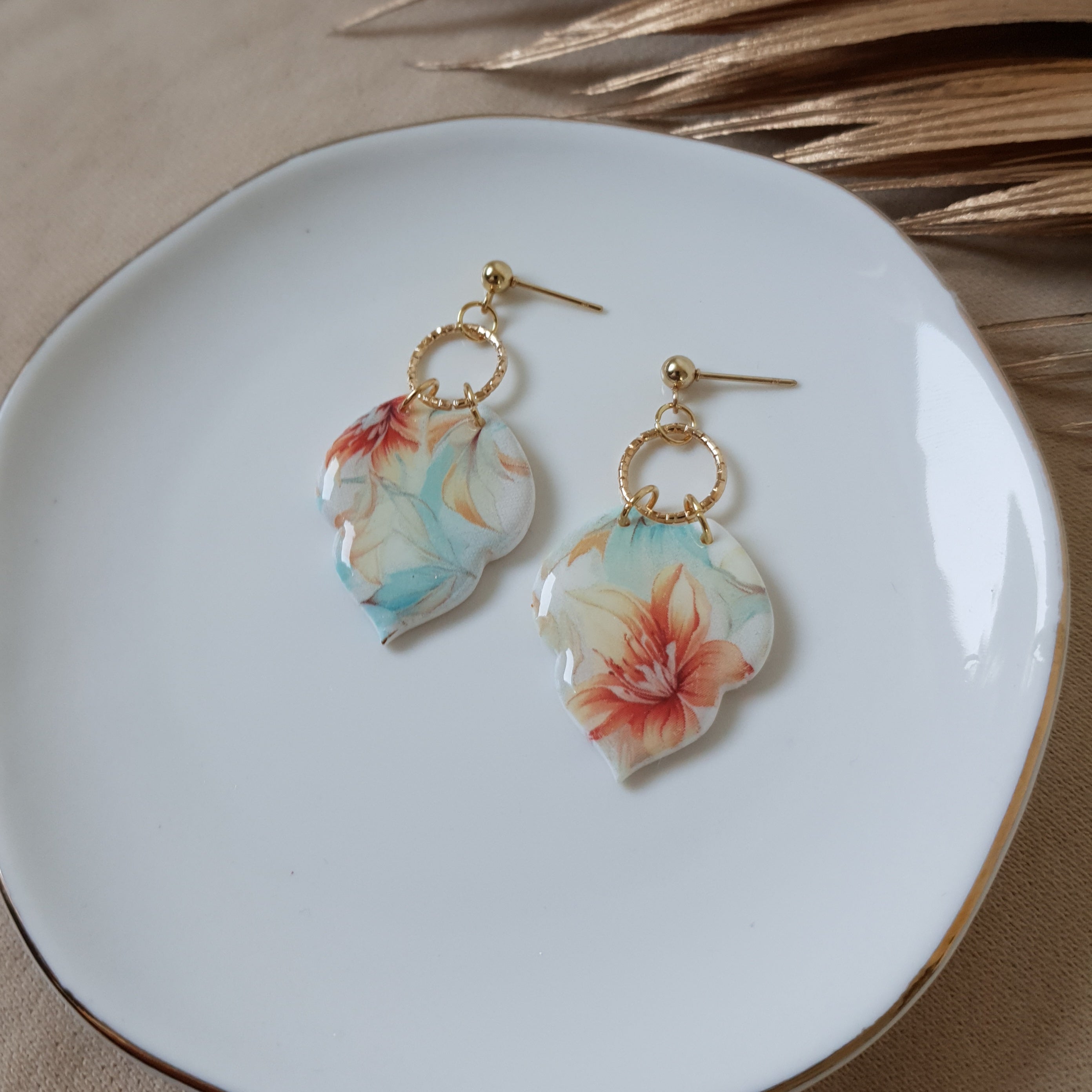 Handmade floral dangle earrings. Size – total length: 4.9 cm or 1.92 inch. Surface-texture: glossy. Jewelry material: polymer clay, resin, stainless steel.
