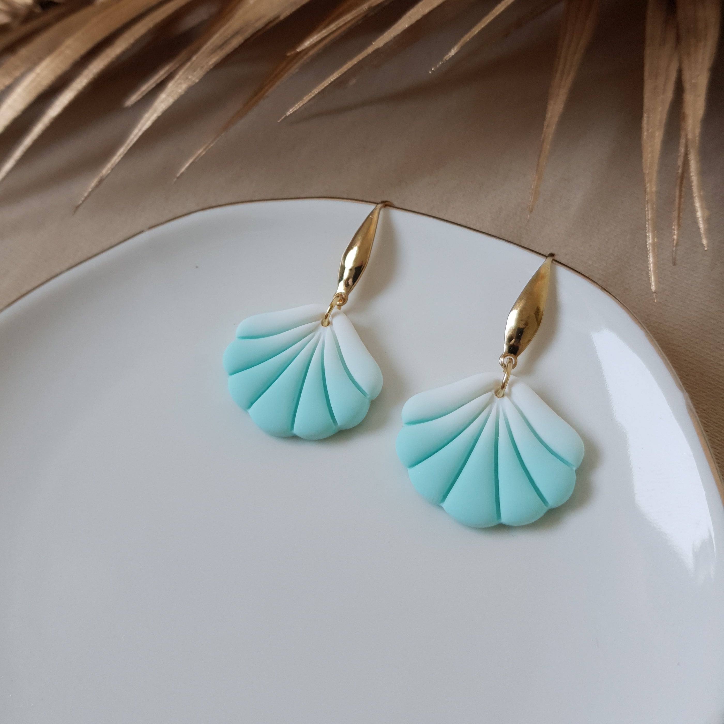 Handmade sea shell dangle earrings. Size – total length: 4.2 cm or 1.65 inch. Surface-texture: matte, glossy (backside). Jewelry material: polymer clay, resin, stainless steel.