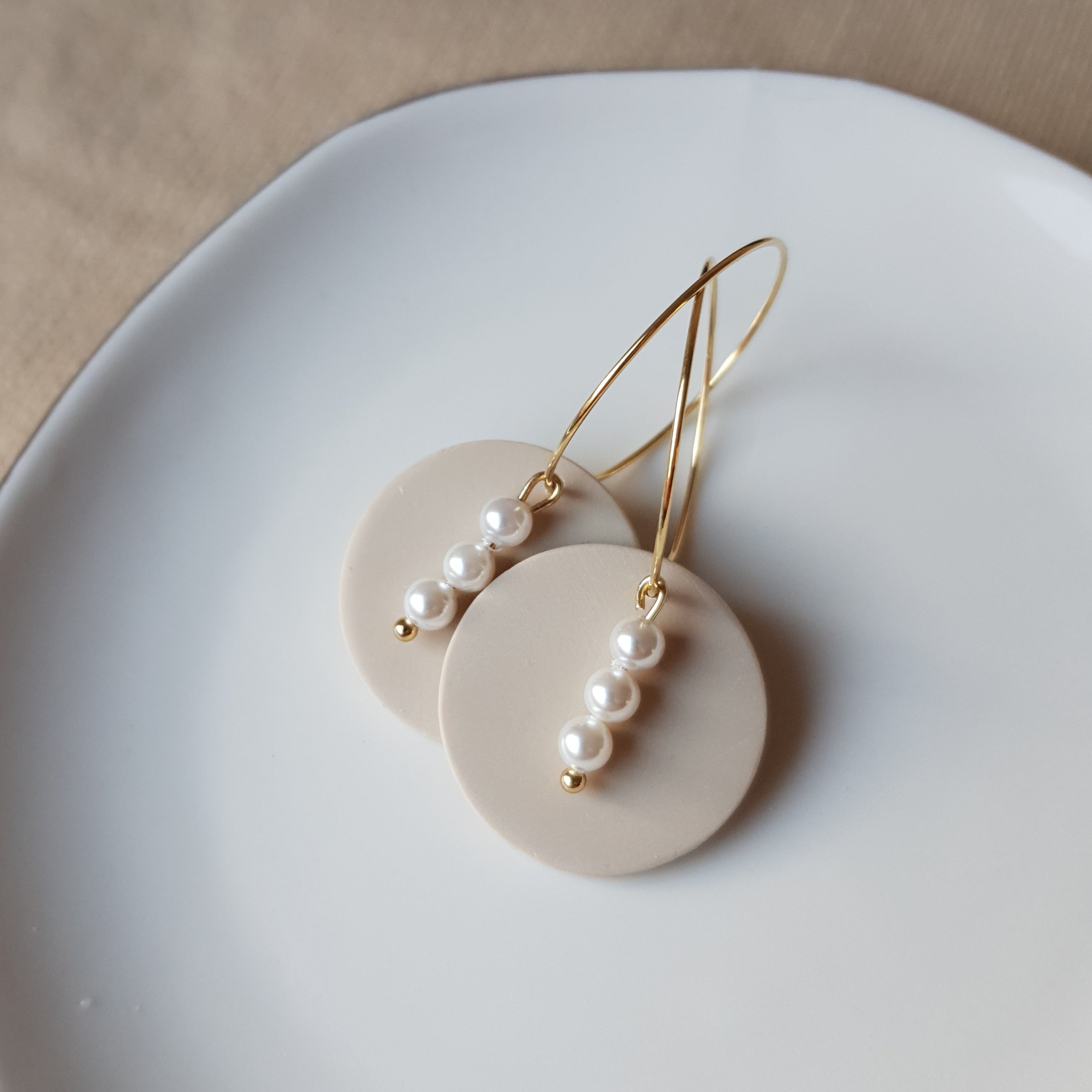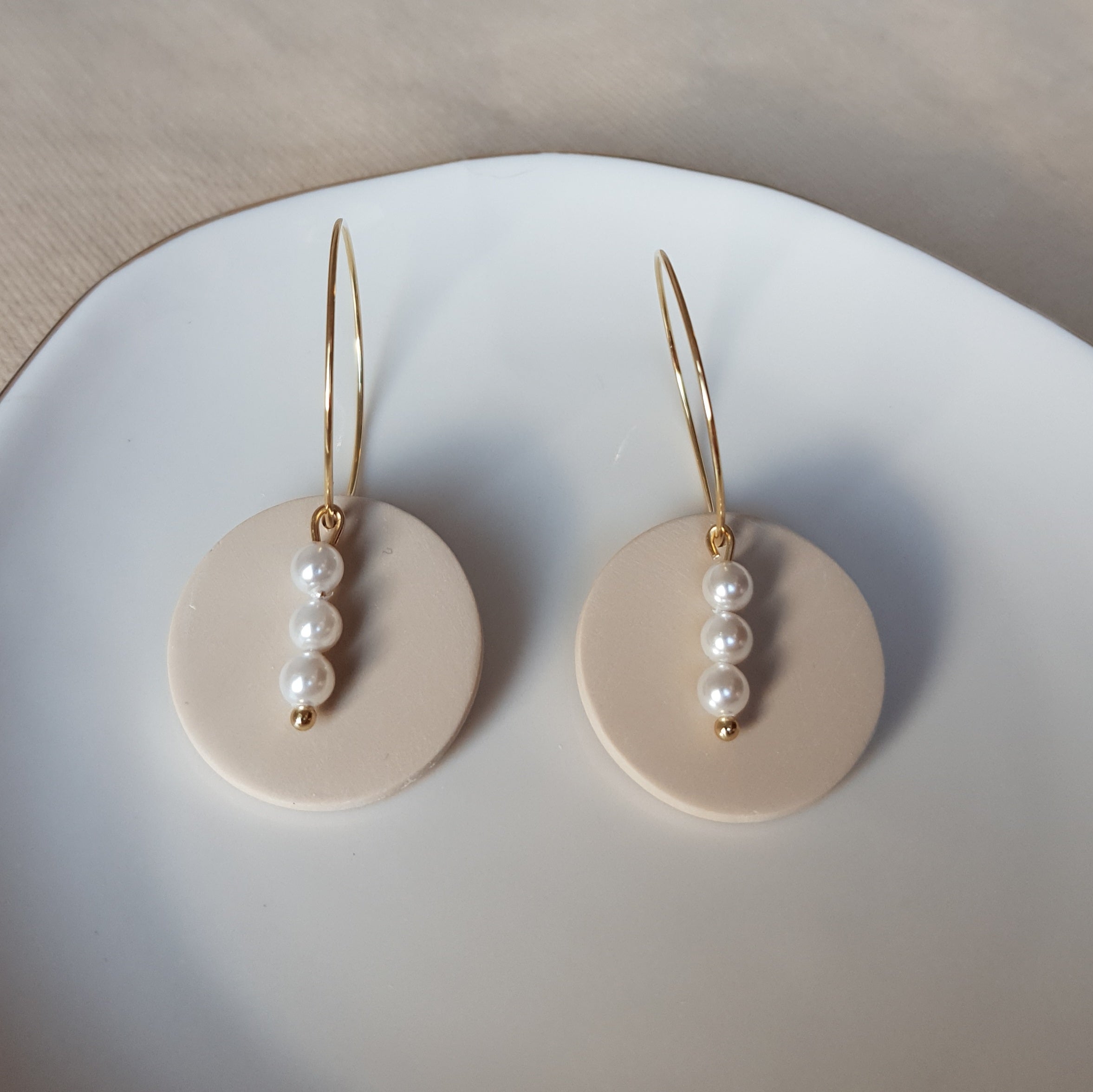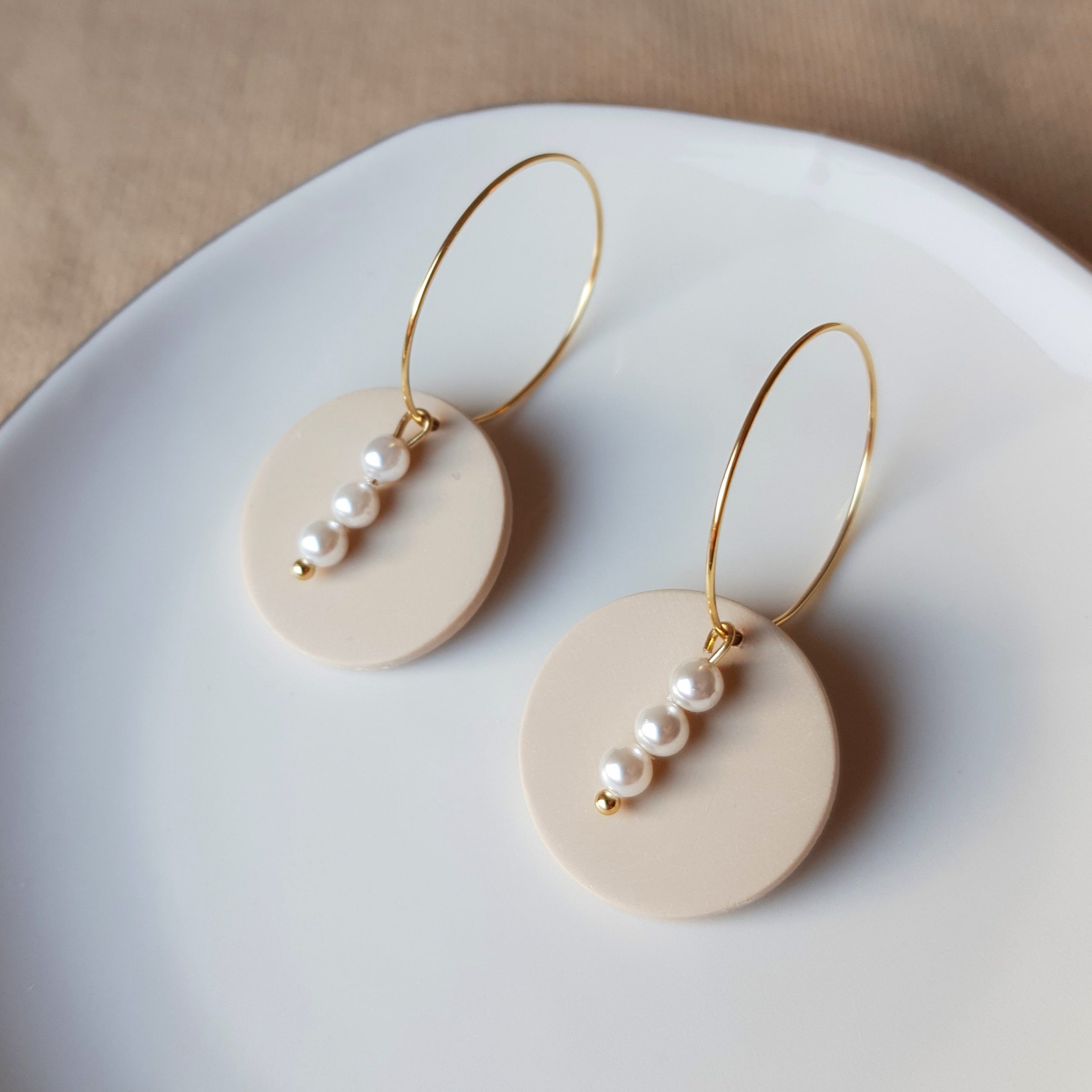 Handmade neutral hoops with glass beads. Size – total length: 4.6 cm or 1.81 inch. Surface-texture: matte, glossy (backside). Jewelry material: polymer clay, resin, stainless steel, glass beads.