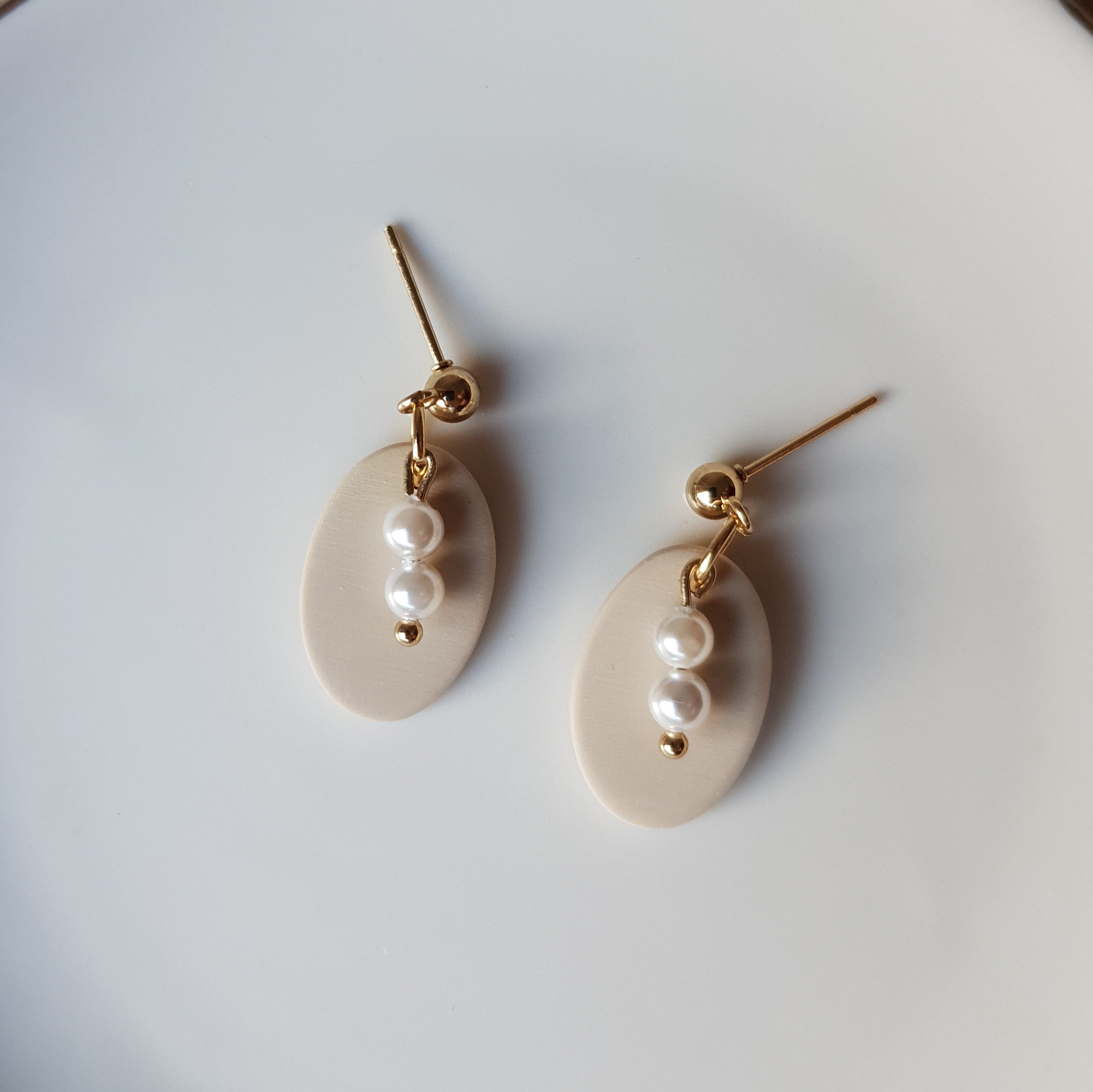 Handmade neutral dangle earrings with glass beads. Size – total length: 2.9 cm or 1.14 inch. Surface-texture: matte, glossy (backside). Jewelry material: polymer clay, resin, stainless steel, glass beads.