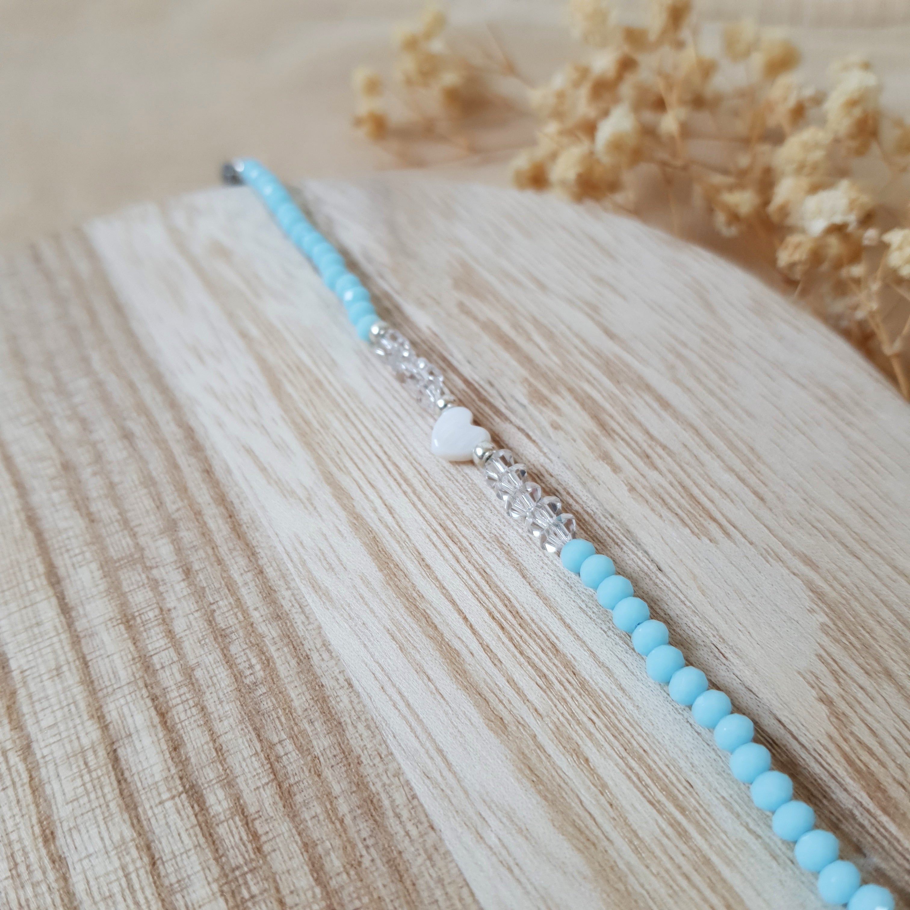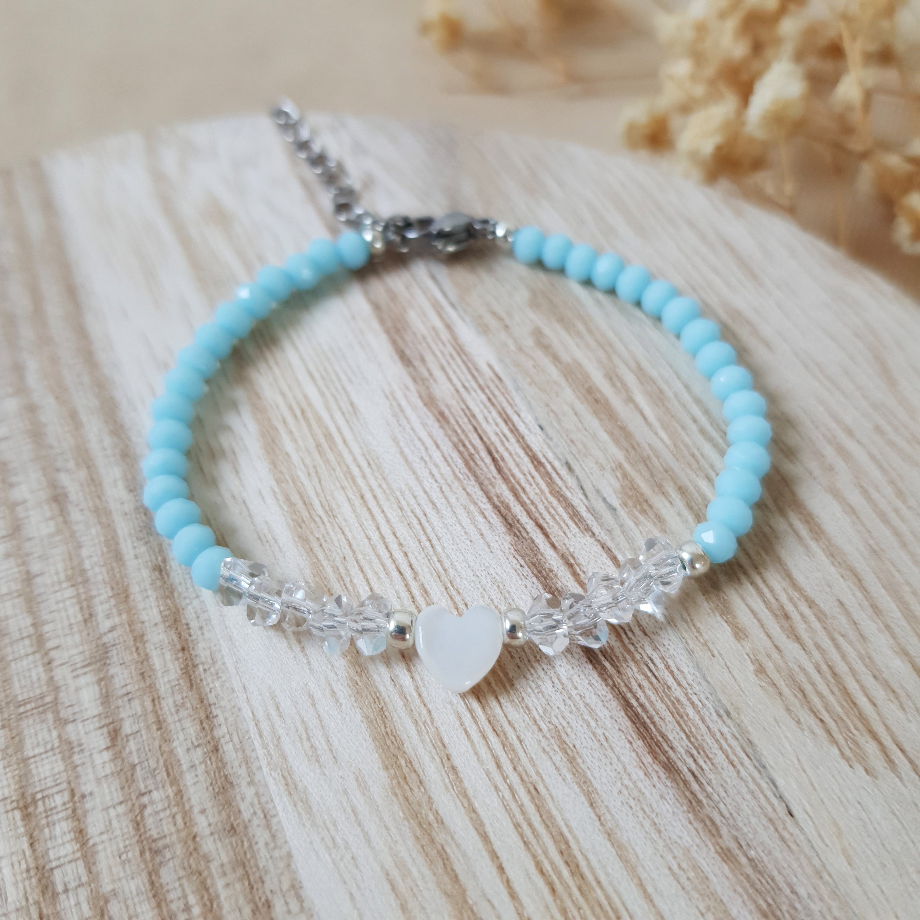 Handmade Pearl blue heart bracelet. Size: adjustable – universal. Jewelry material: shell, glass, stainless steel.