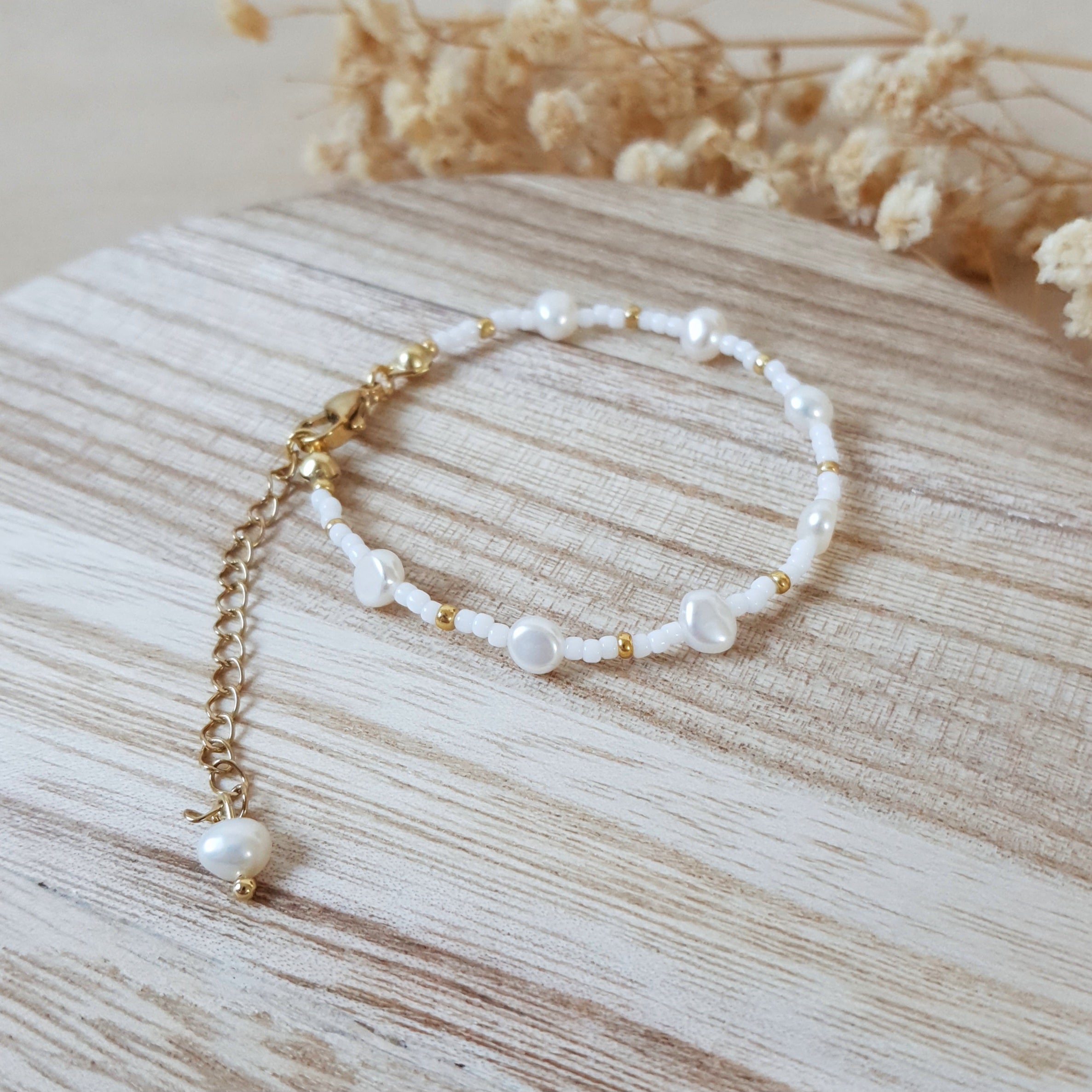 Handmade Mini Pearl bracelet. Size: adjustable – universal. Jewelry material: freshwater pearls, glass, gold plated stainless steel. Bead size: 2 mm and 5 mm.