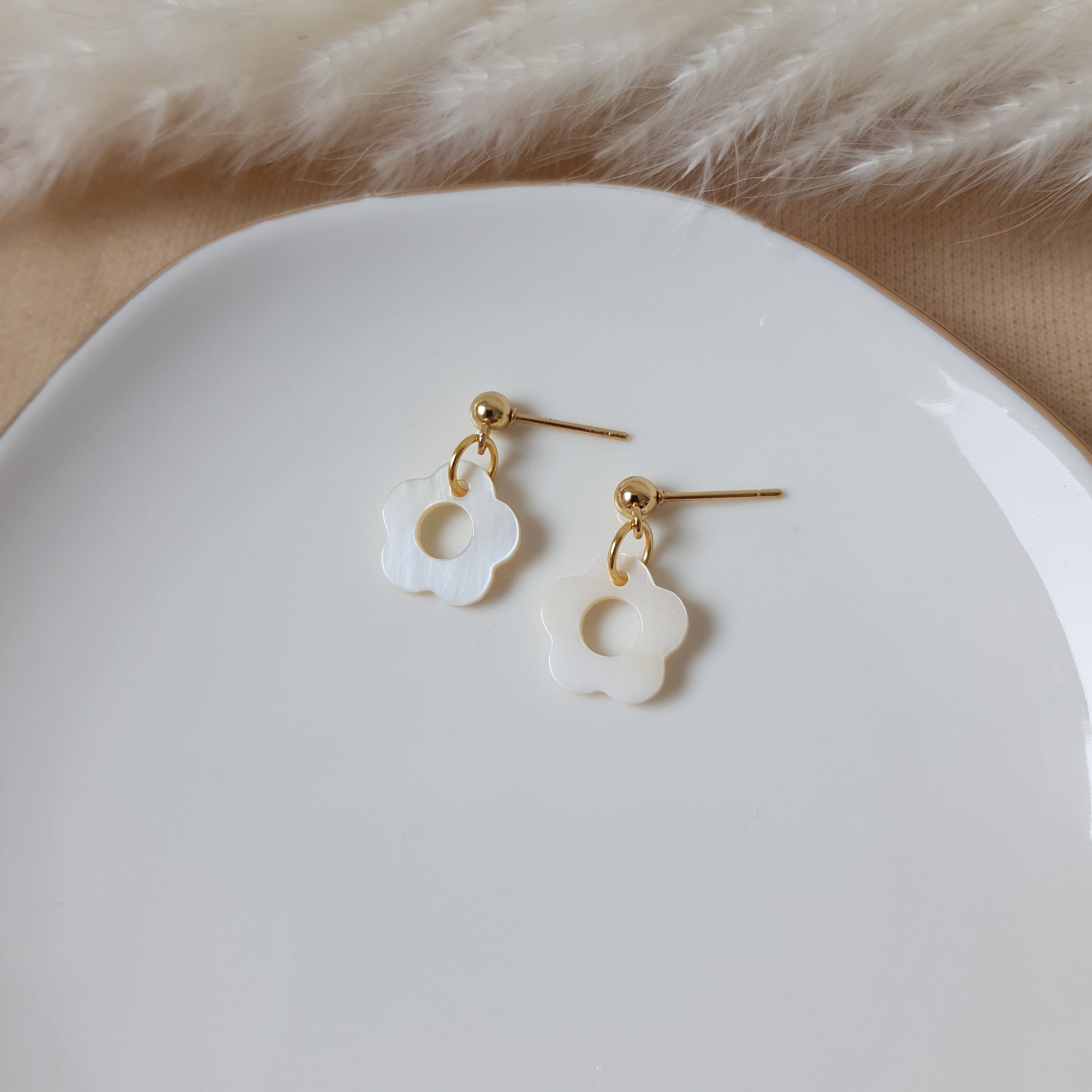 Mini daisy dangle earrings. Total length of earrings: 2.1 cm or 0.82 inch Jewelry material: shell, stainless steel.