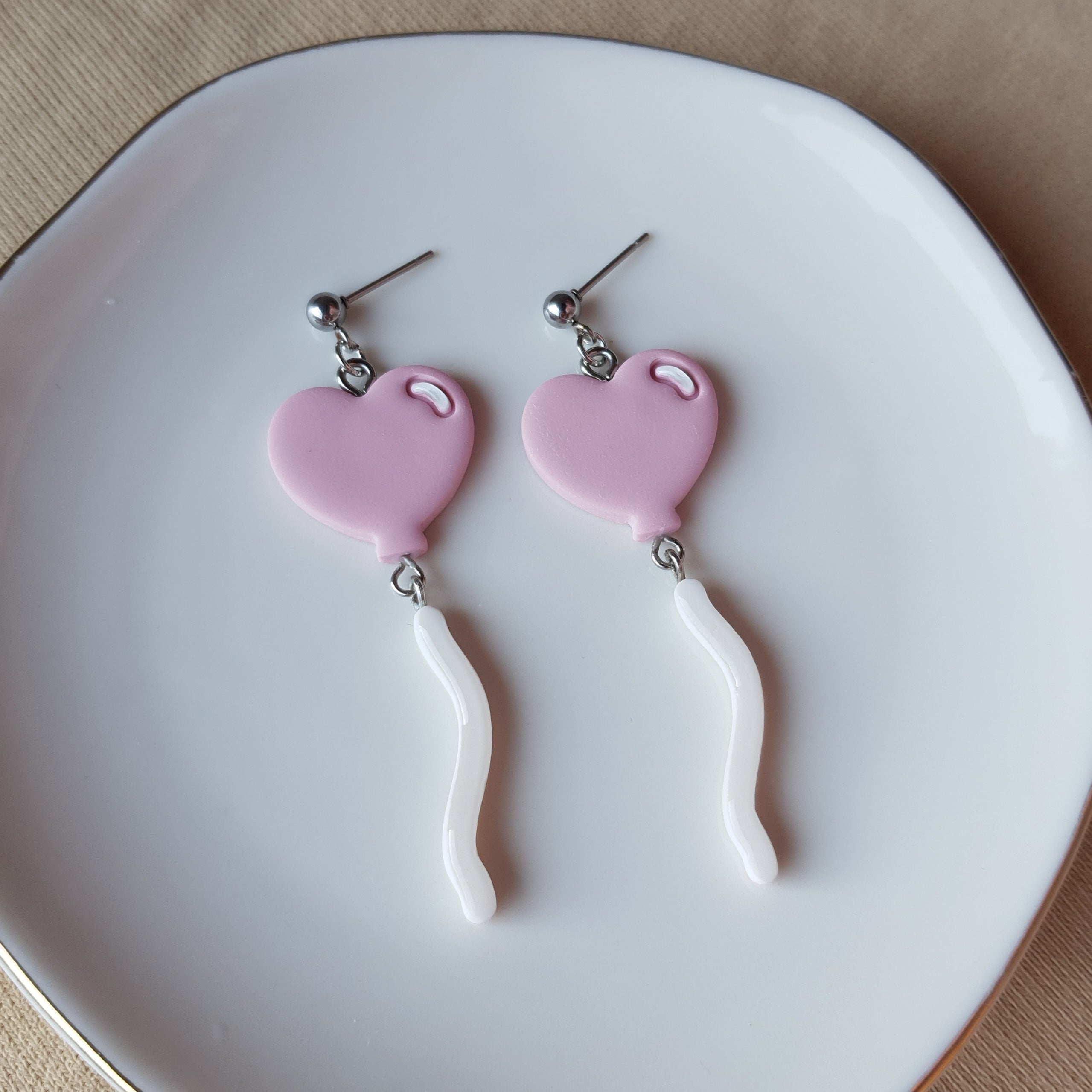 Handmade pink balloon earrings. Size – total length: 6.5 cm or 2.55 inch. Surface-texture: matte, glossy. Jewelry material: polymer clay, resin, stainless steel.