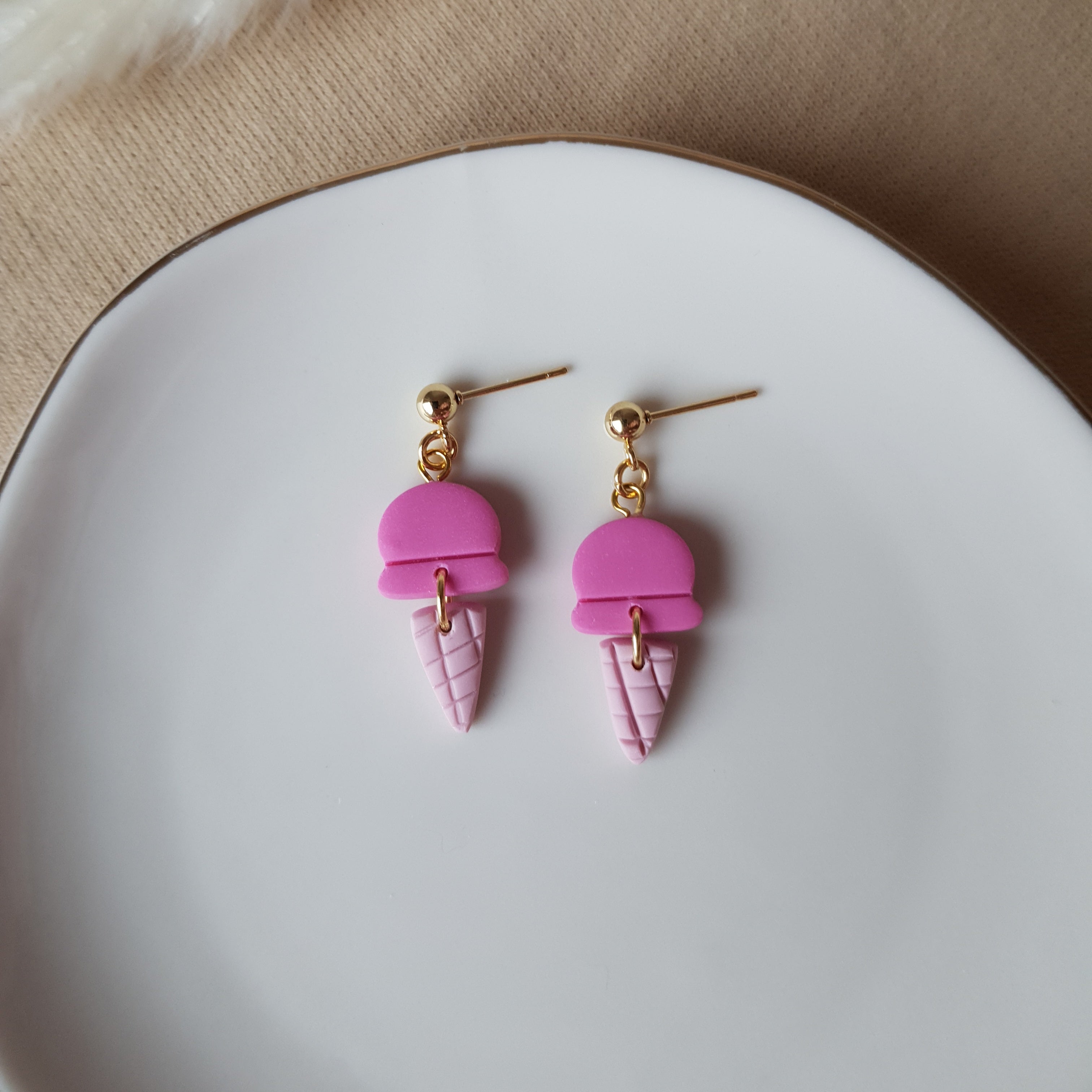 Handmade pink ice cream earrings. Size – total length: 3.6 cm or 1.41 inch. Surface-texture: matte, semi-glossy. Jewelry material: polymer clay, stainless steel.