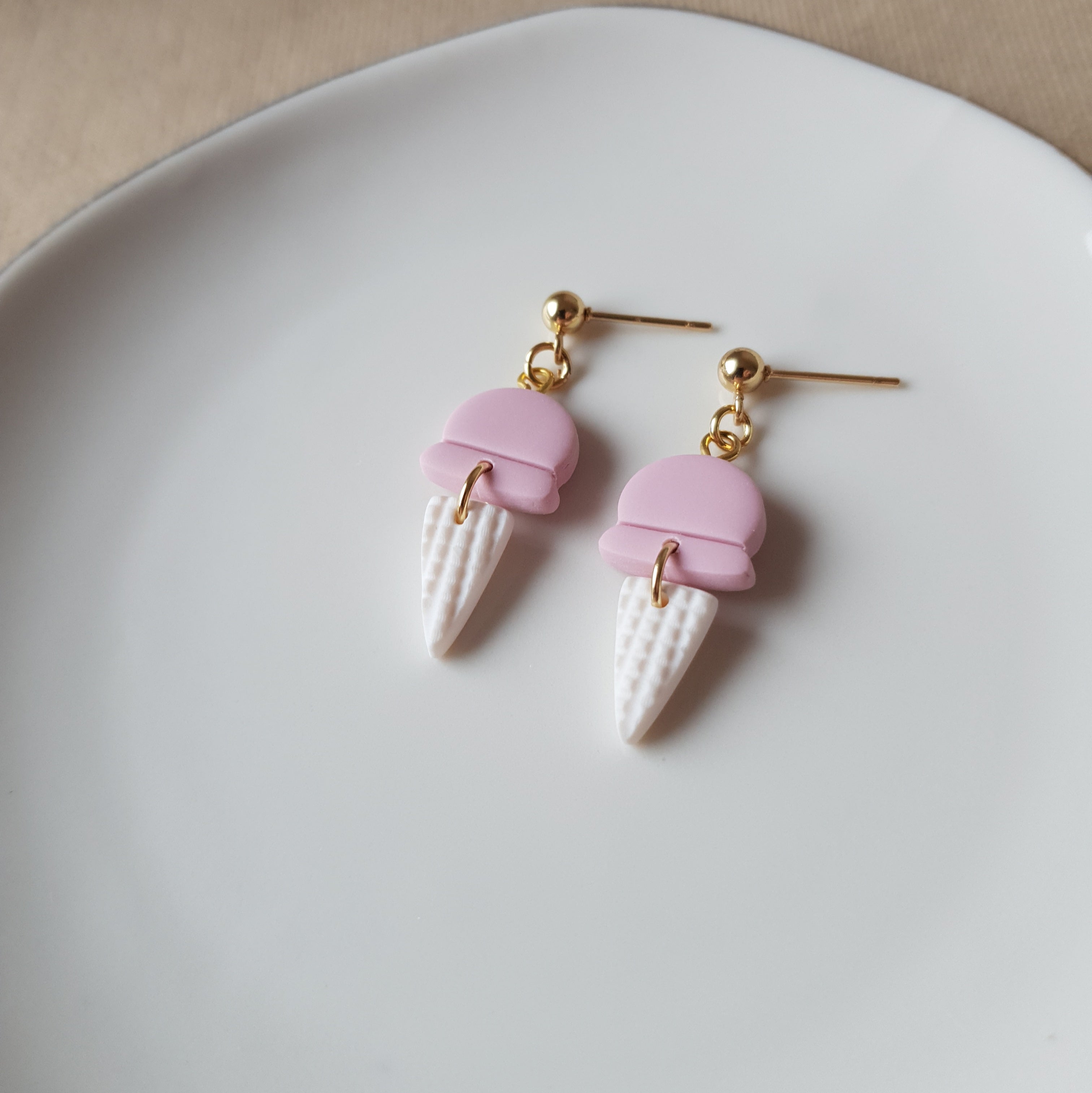 Handmade pink ice cream earrings. Size – total length: 3.6 cm or 1.41 inch. Surface-texture: matte, semi-glossy. Jewelry material: polymer clay, stainless steel.