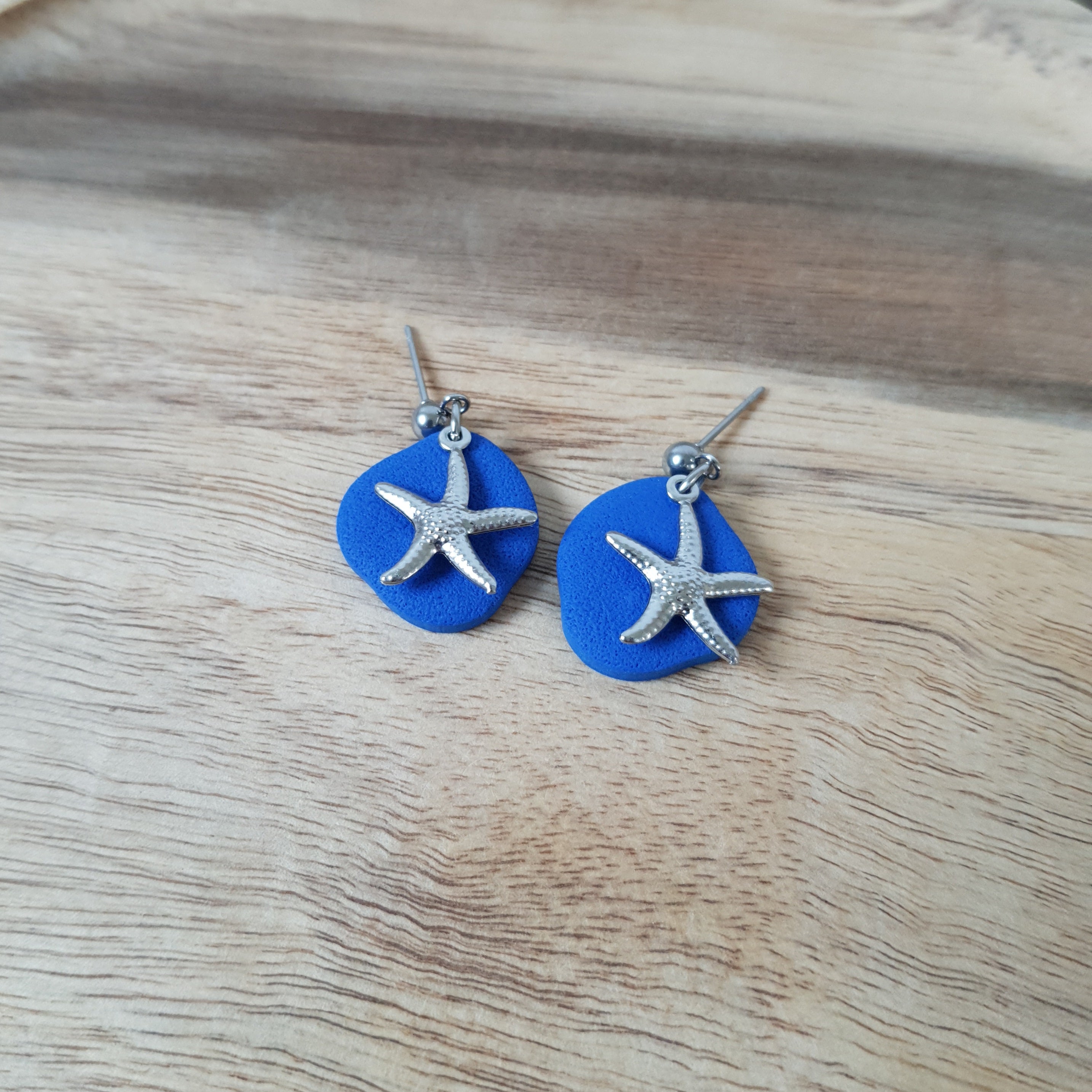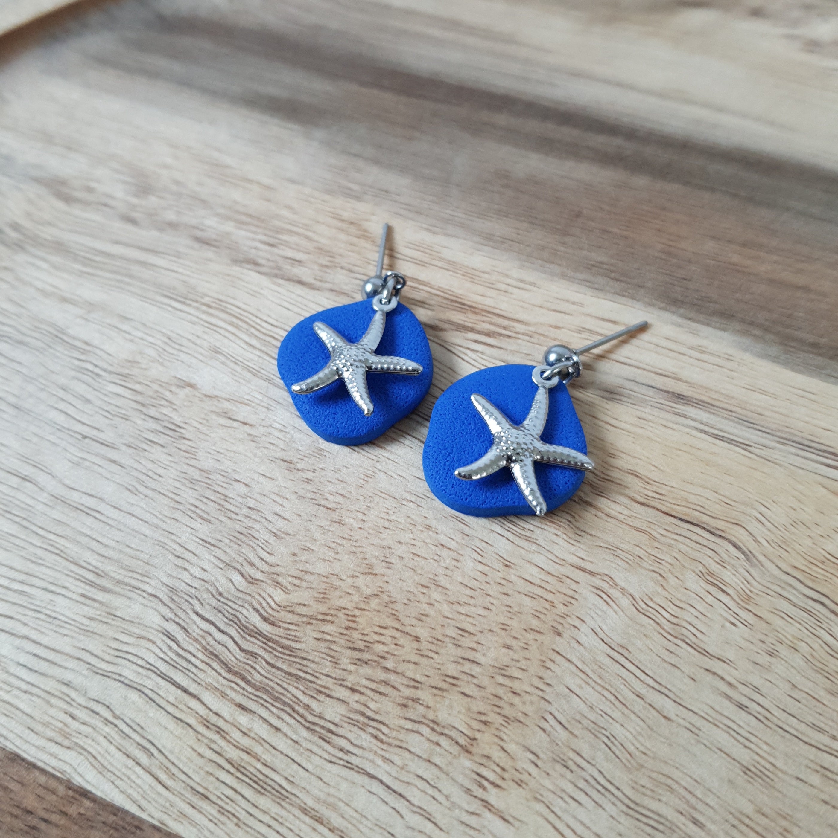 Handmade sea star dangle earrings. Size – total length: 2.8 cm or 1.10 inch. Surface-texture: matte, glossy (backside). Jewelry material: polymer clay, stainless steel.