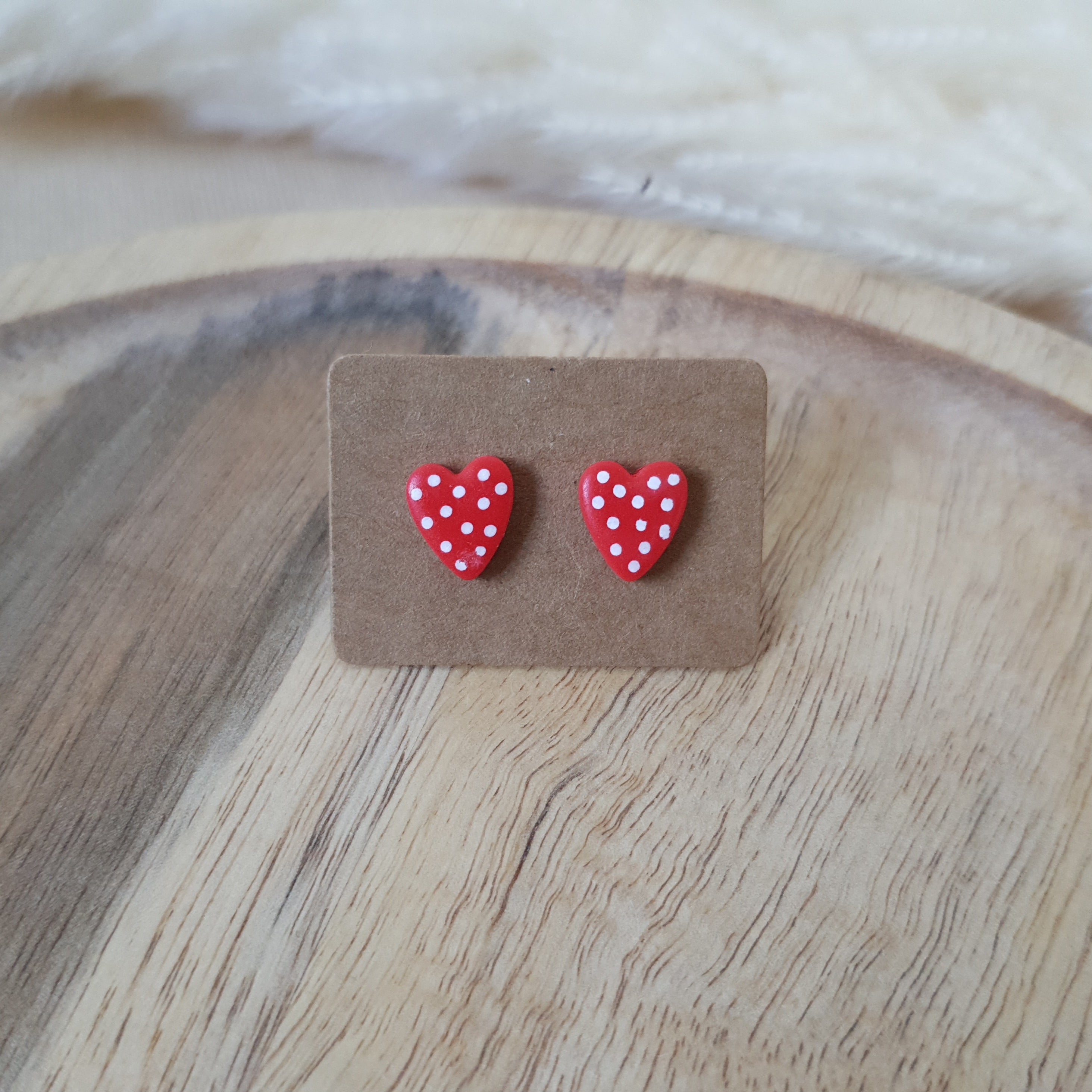 Handmade spotted heart stud earrings. Size – total length: 1 cm or 0.39 inch. Surface-texture: semi-glossy. Jewelry material: polymer clay, resin, stainless steel.