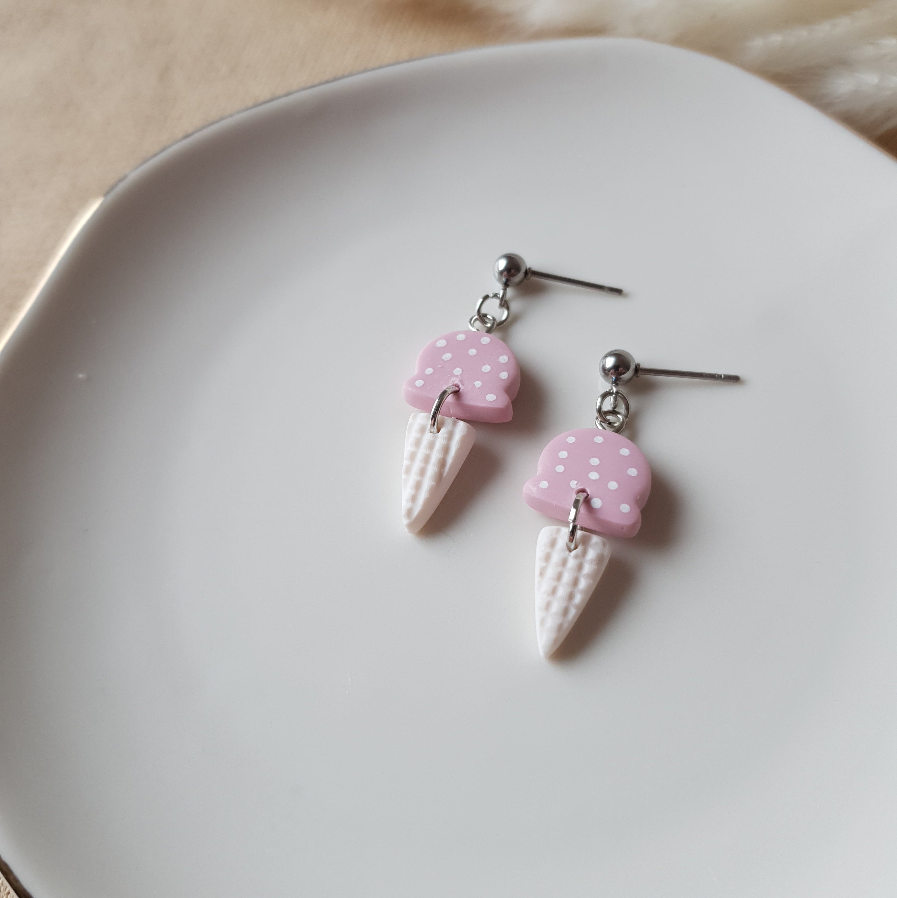 Handmade pink ice cream earrings. Size – total length: 3.6 cm or 1.41 inch. Surface-texture: matte, semi-glossy. Jewelry material: polymer clay, stainless steel.